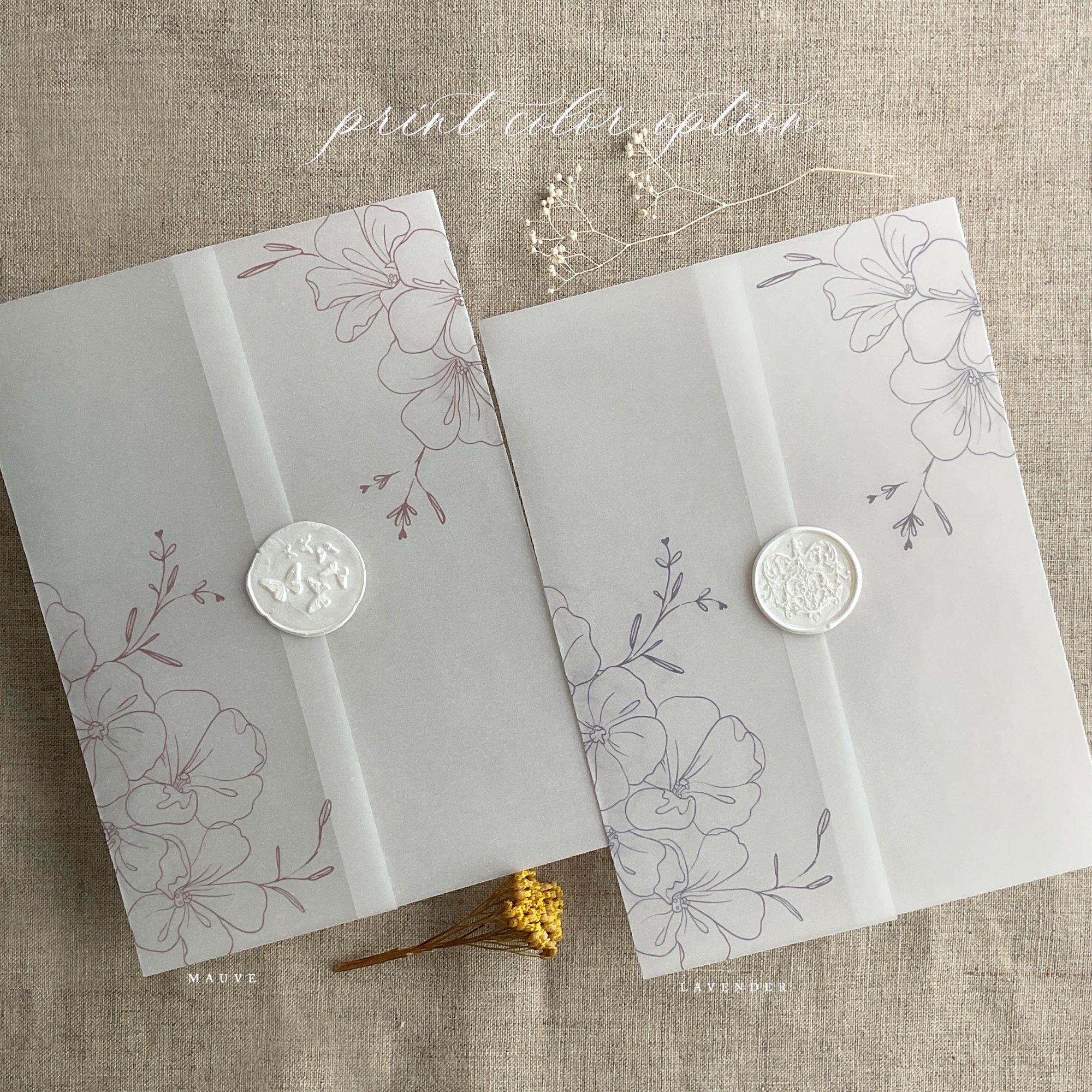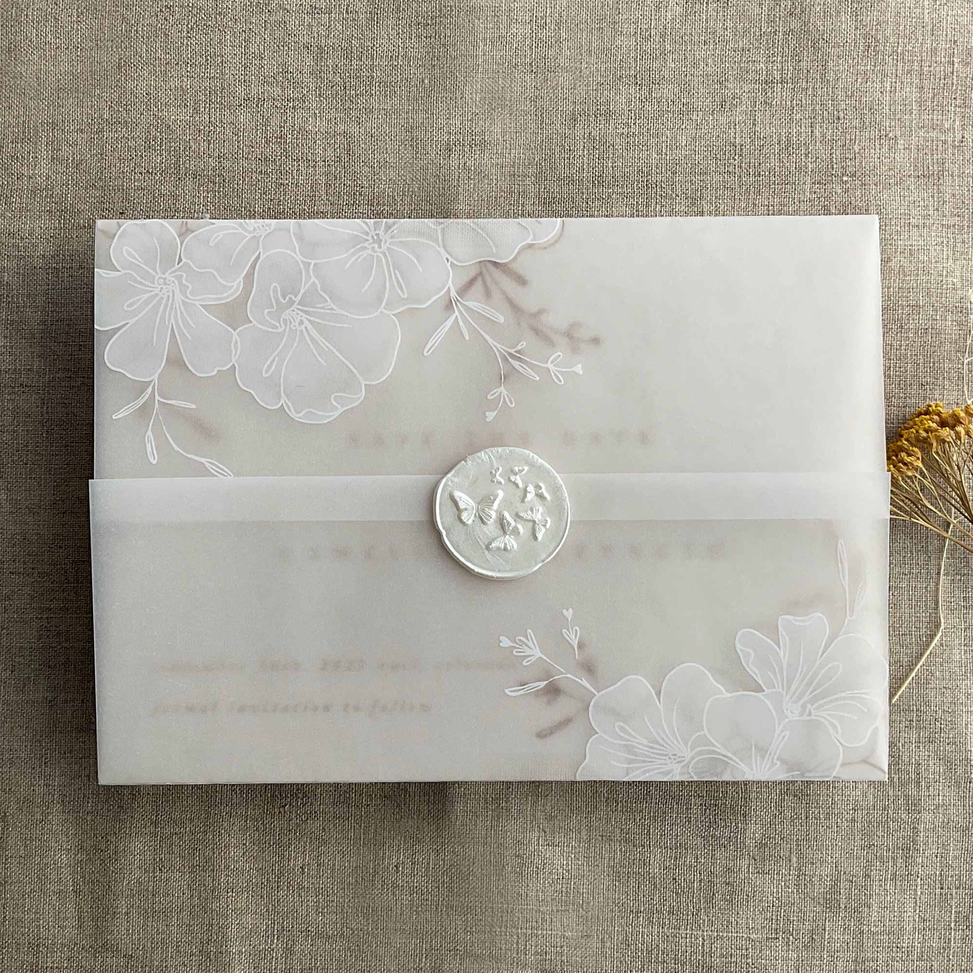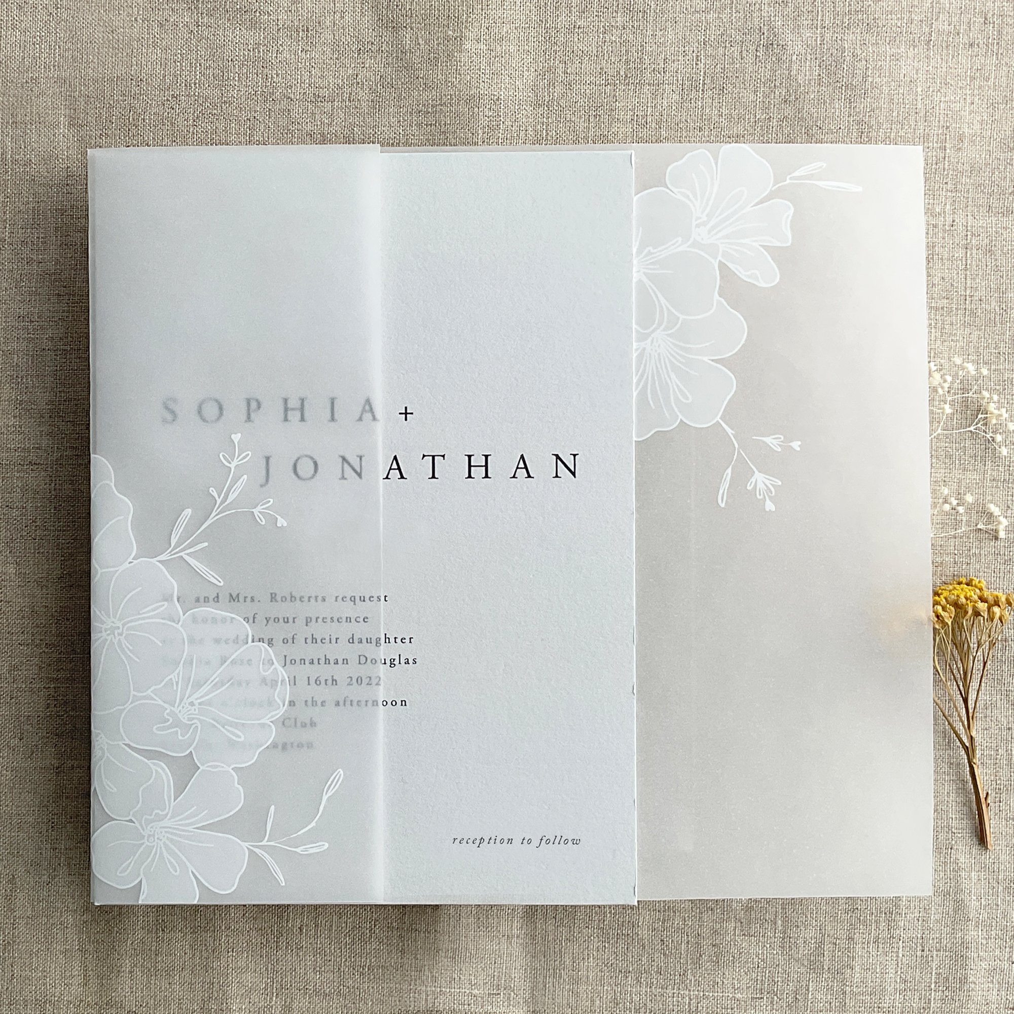 on 29 lb glama natural white translucent vellum paper / Printed in-house by ivory invitations Made In USA