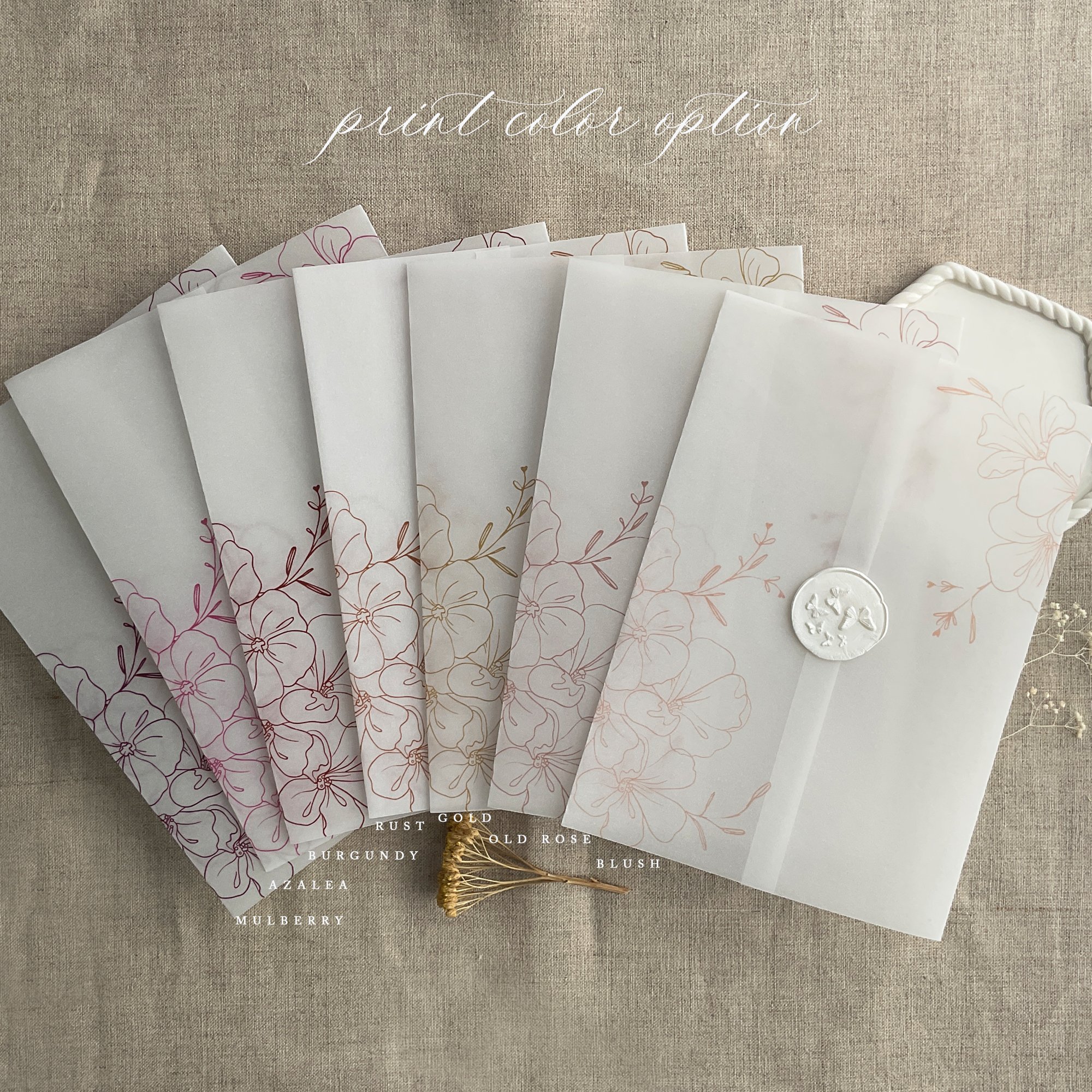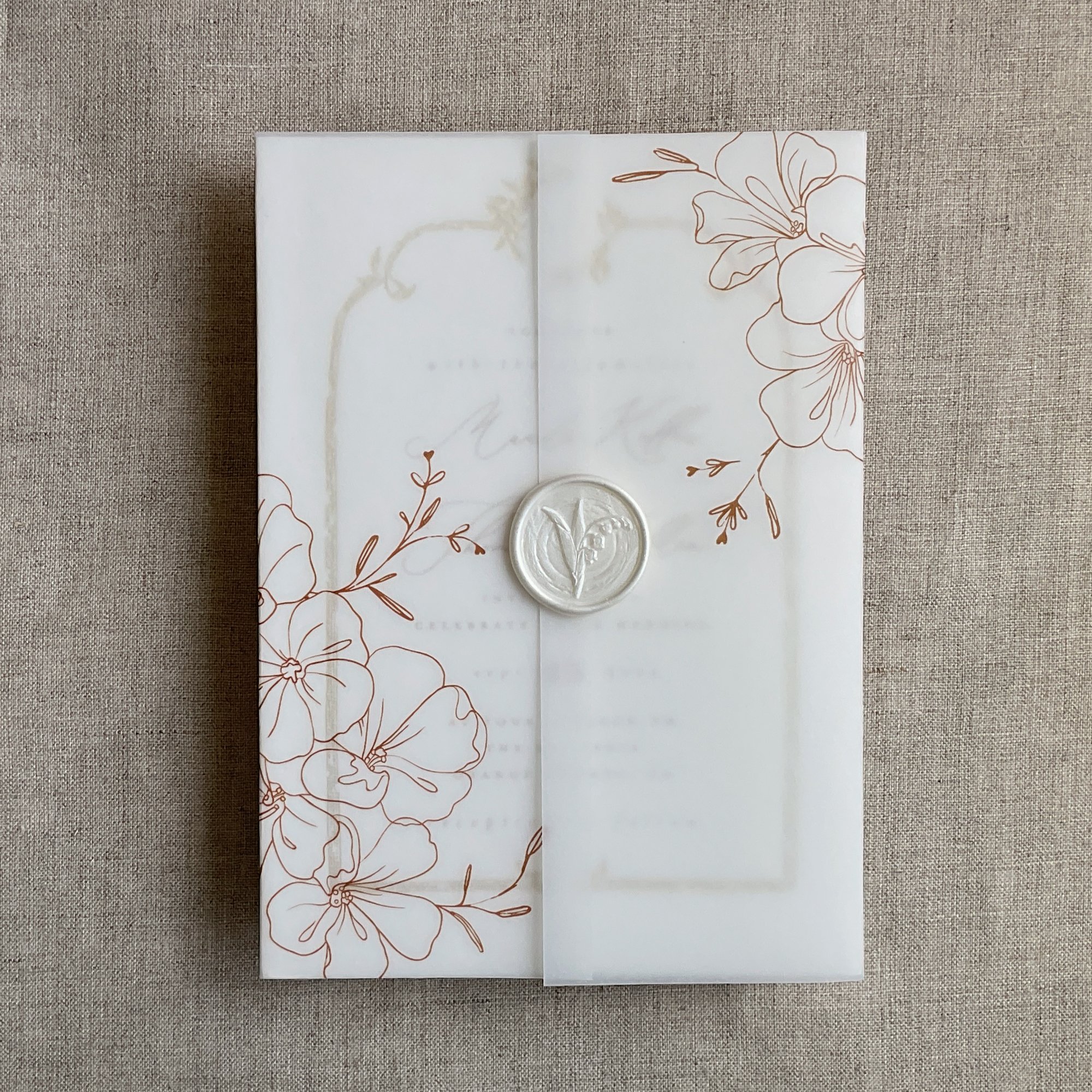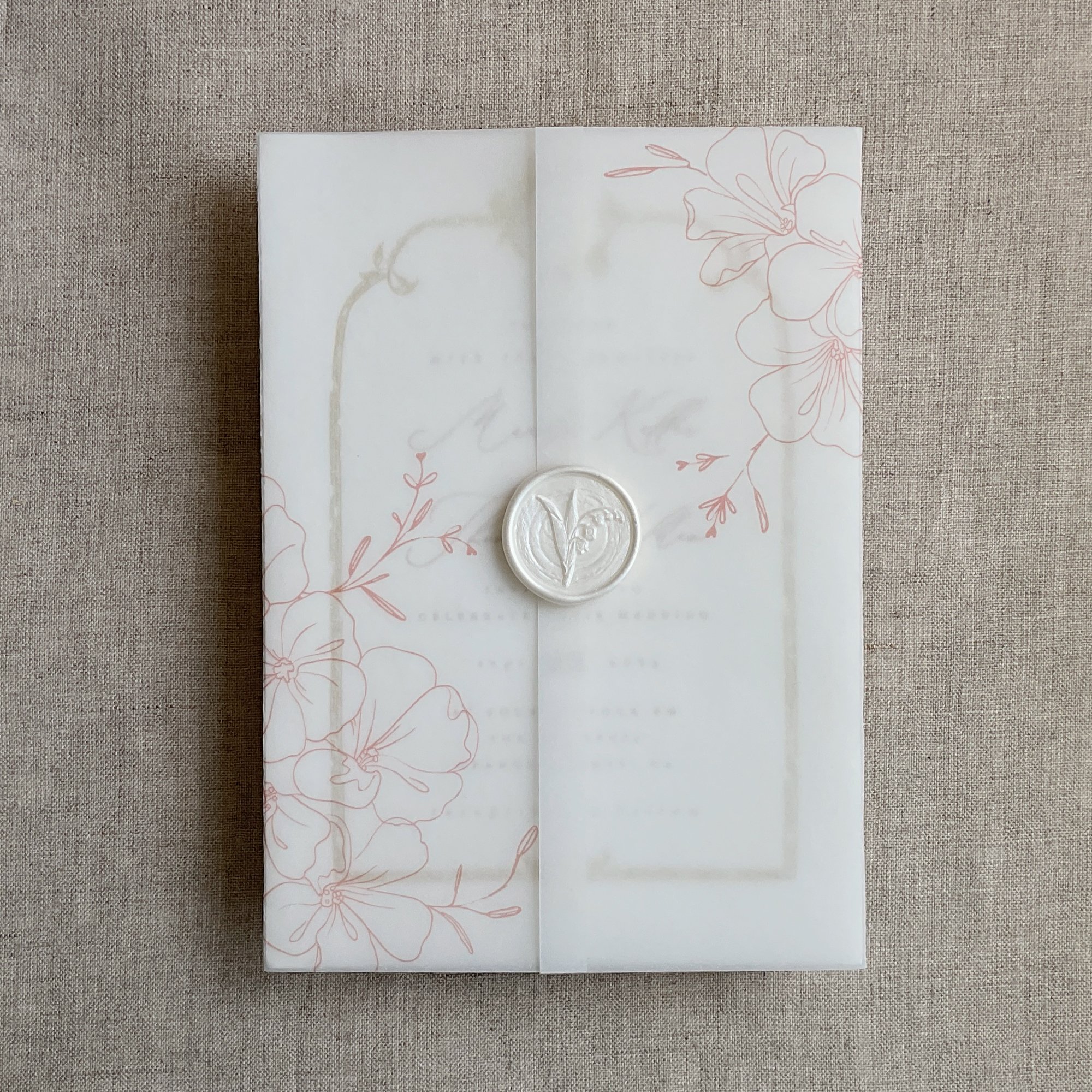 on 29 lb glama natural white translucent vellum paper / Printed in-house by ivory invitations Made In USA