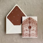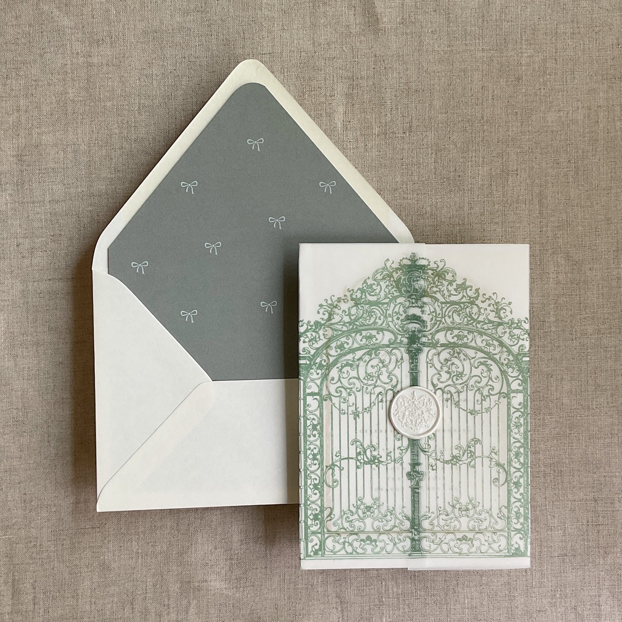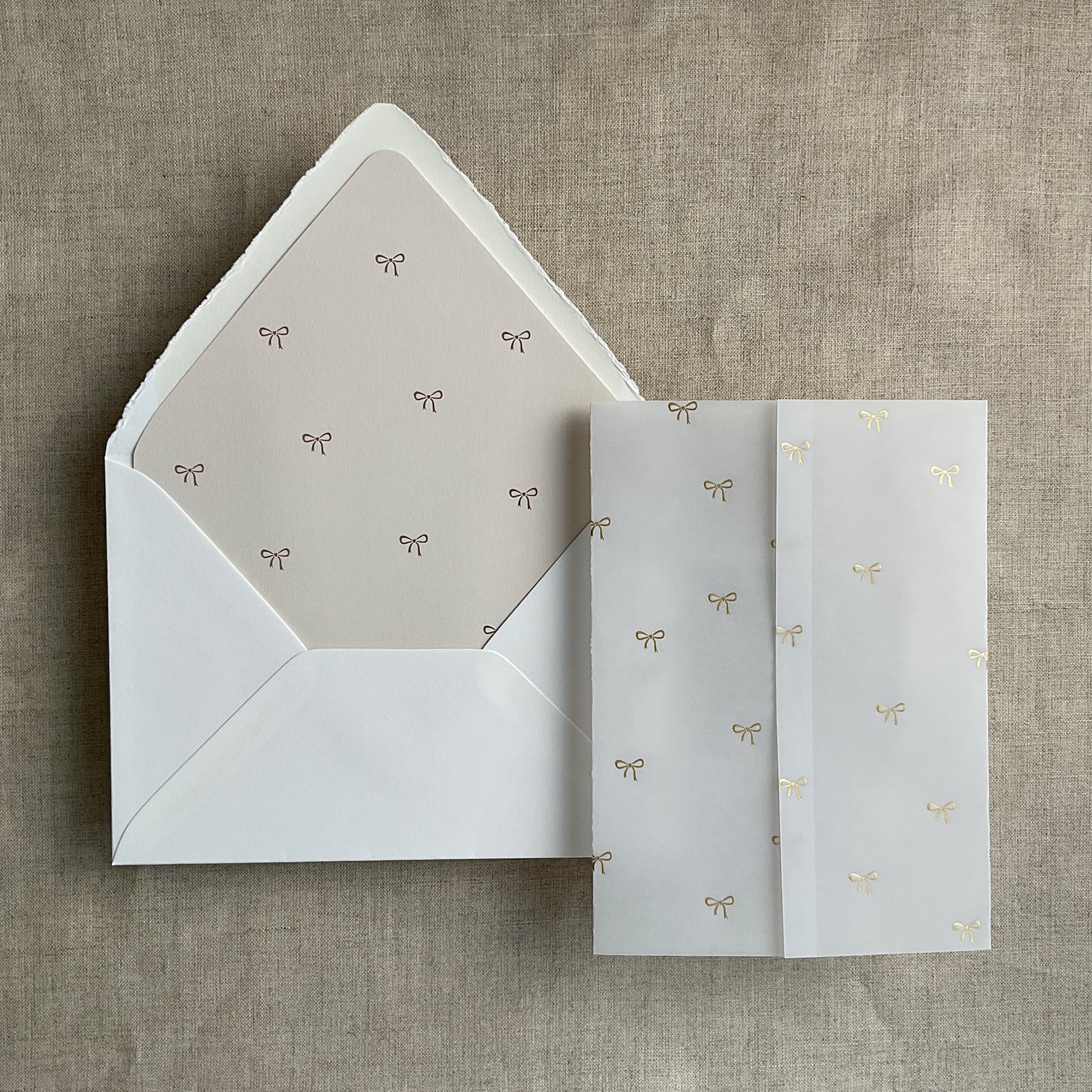 5"x7" (A7 card) pre-fold vellum wrap in a color ink on 29 lb natural white translucent vellum paper / Printed in-house by ivory invitations Made In USA