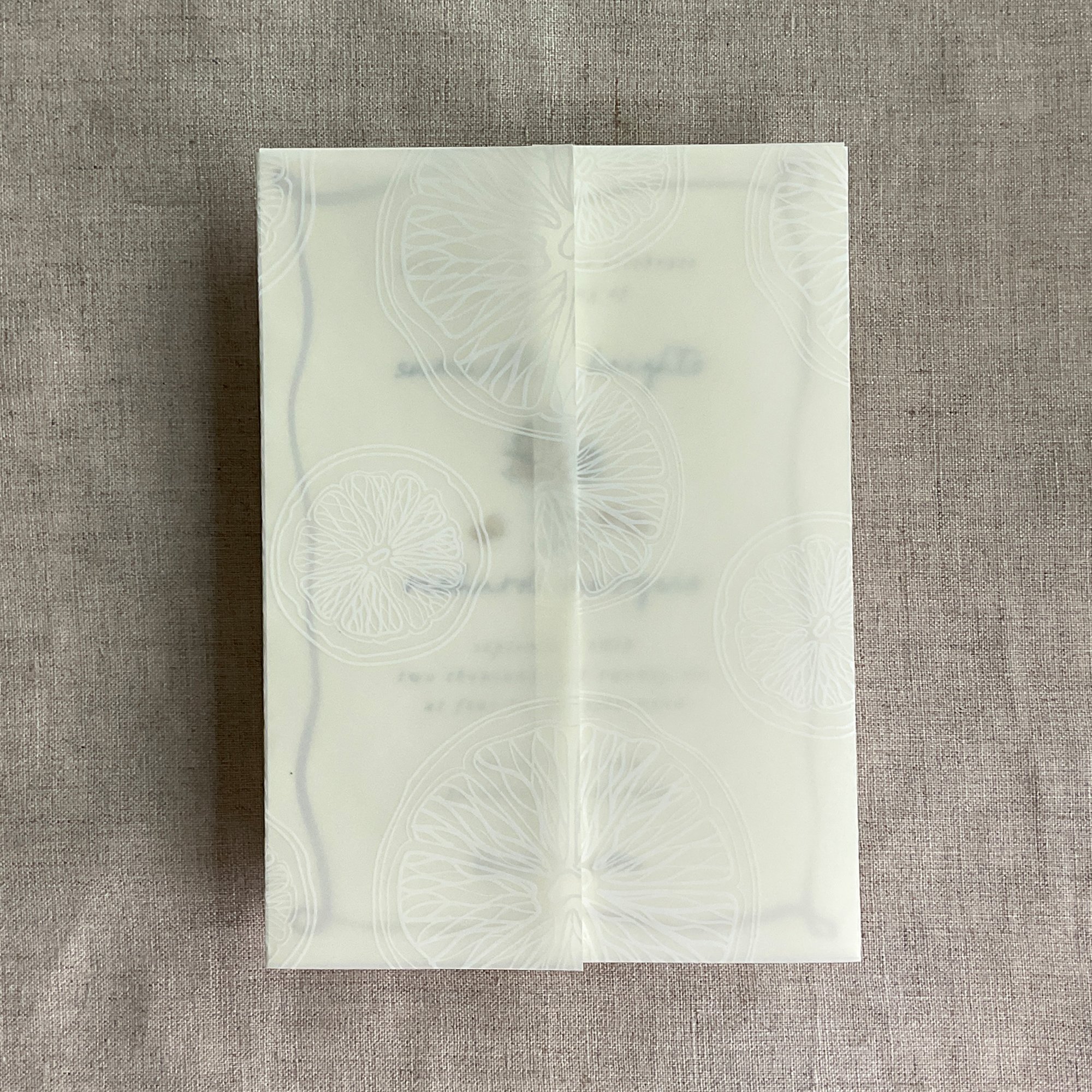 Bright and cheerful, this vellum wrap showcases citrus fruit cross-sections as playful motifs of summer joy and celebration—balancing simplicity with a vibrant accent that brings your invitation to life.