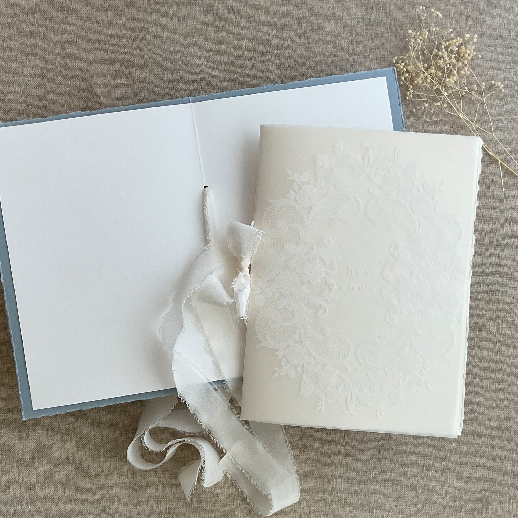 Heirloom handmade vow book is covered vellum paper and colored paper in hand torn deckled edge, hand tied with crepe silk ribbon binding.
