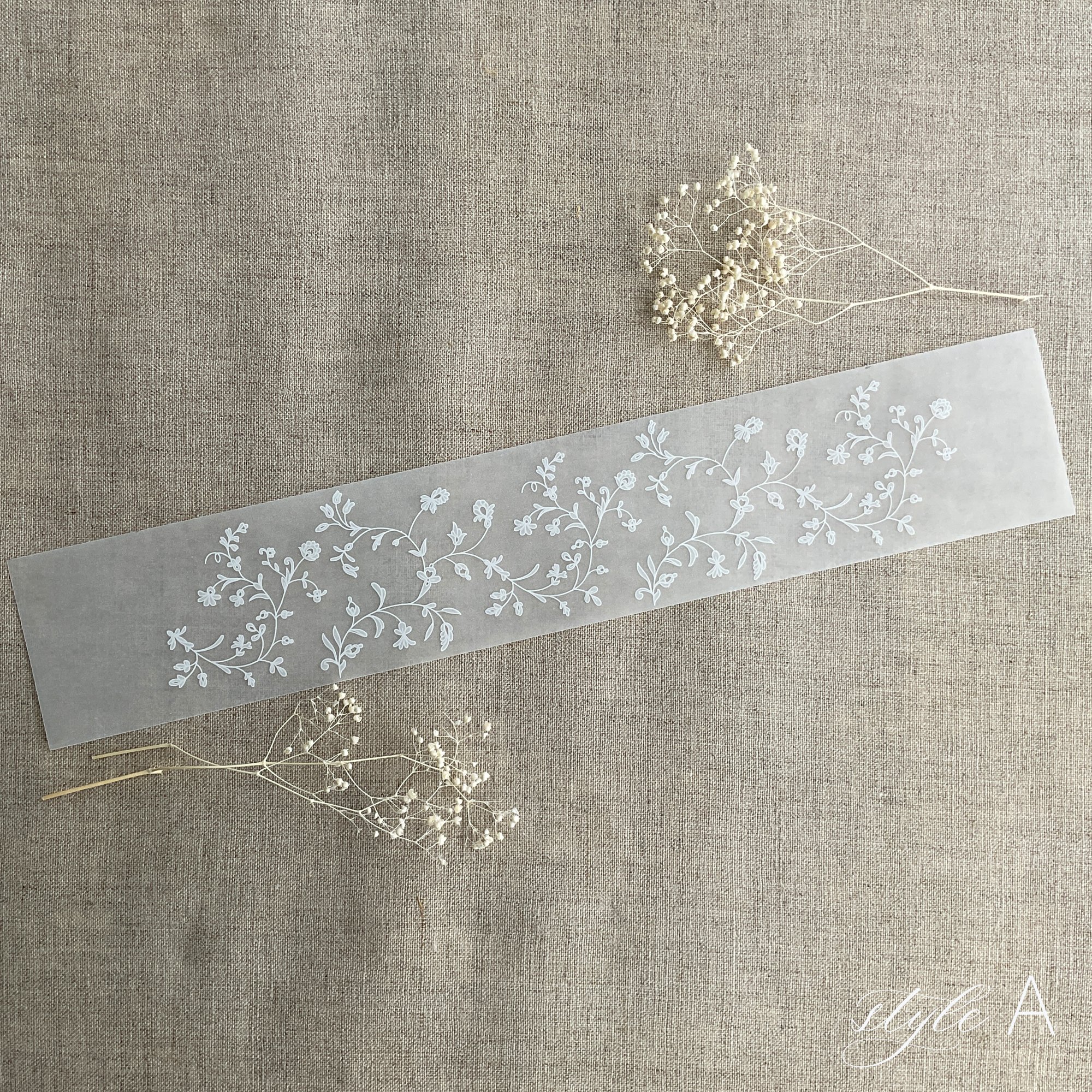 Dainty floral vines lace white ink printed white translucent vellum belly band 2 inch wide for 5x7 card