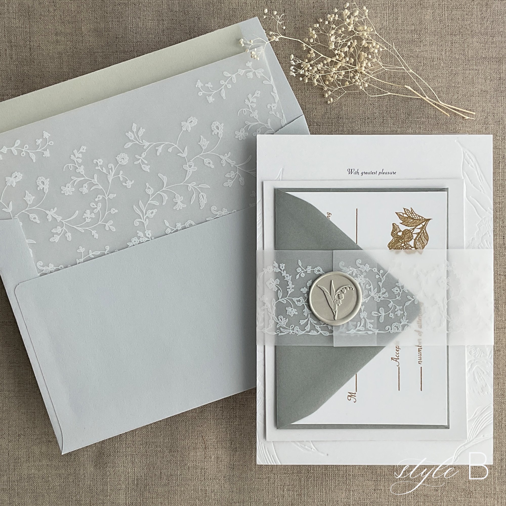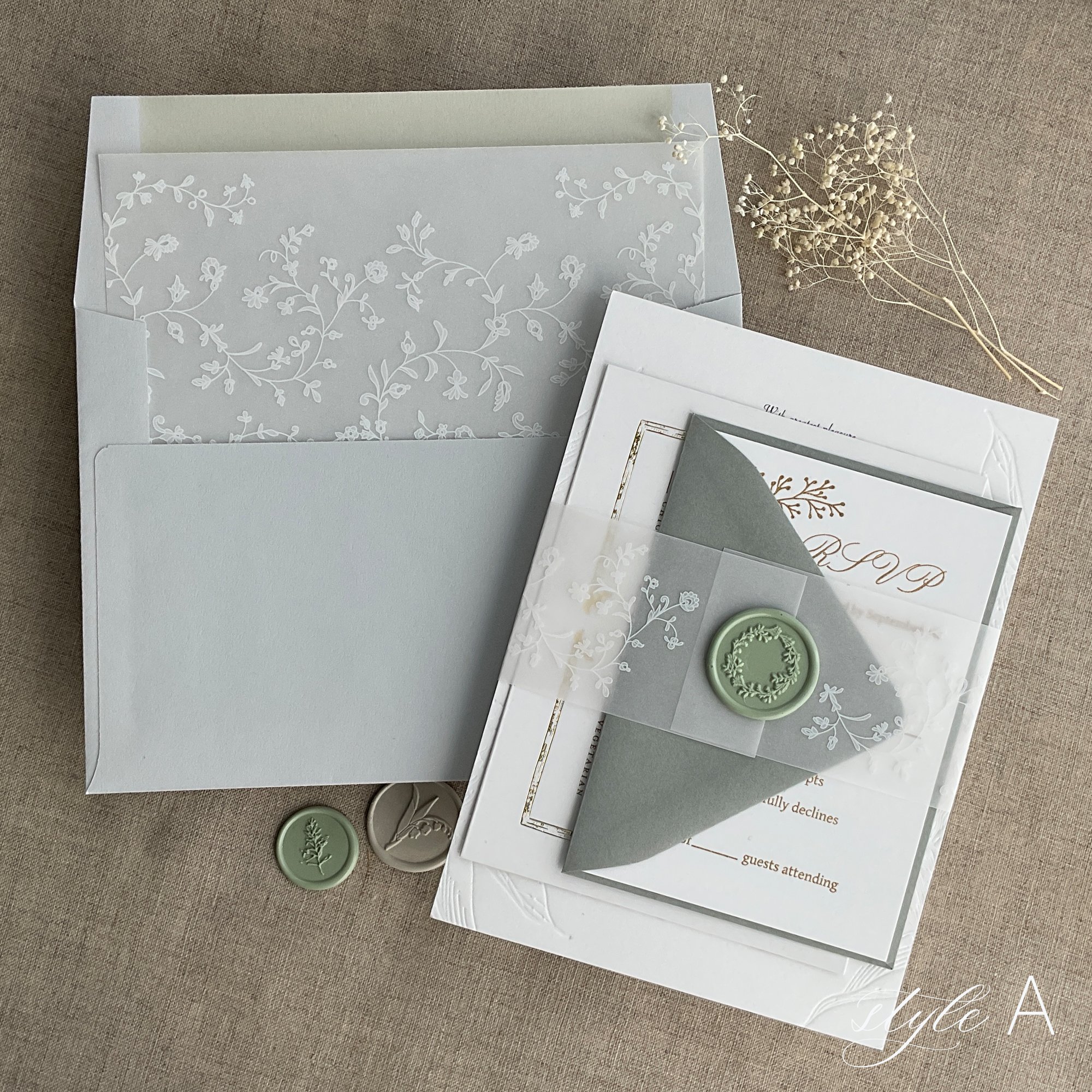 invitations cards and any other items (cards, envelopes, strings, preserved flowers, and etc.)