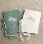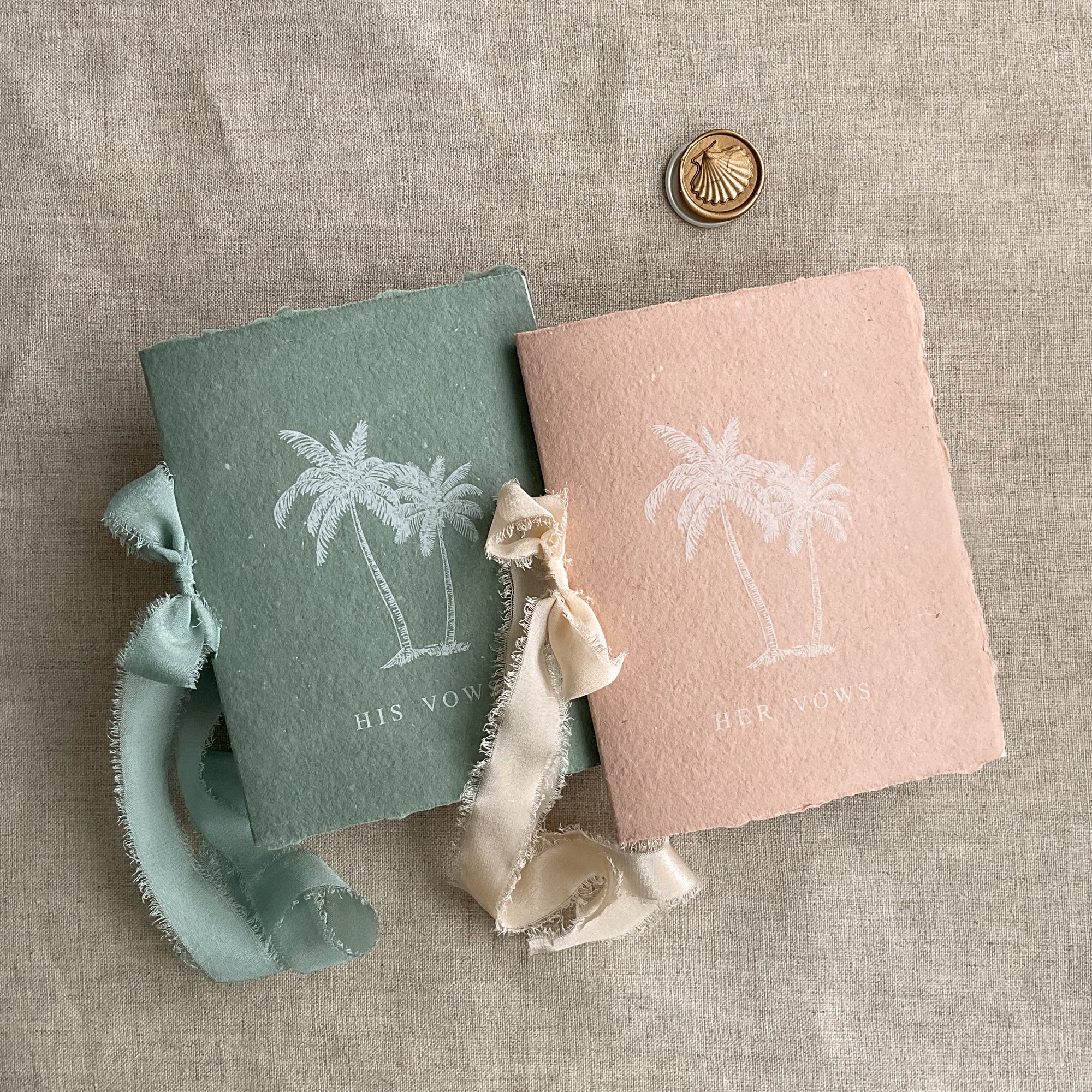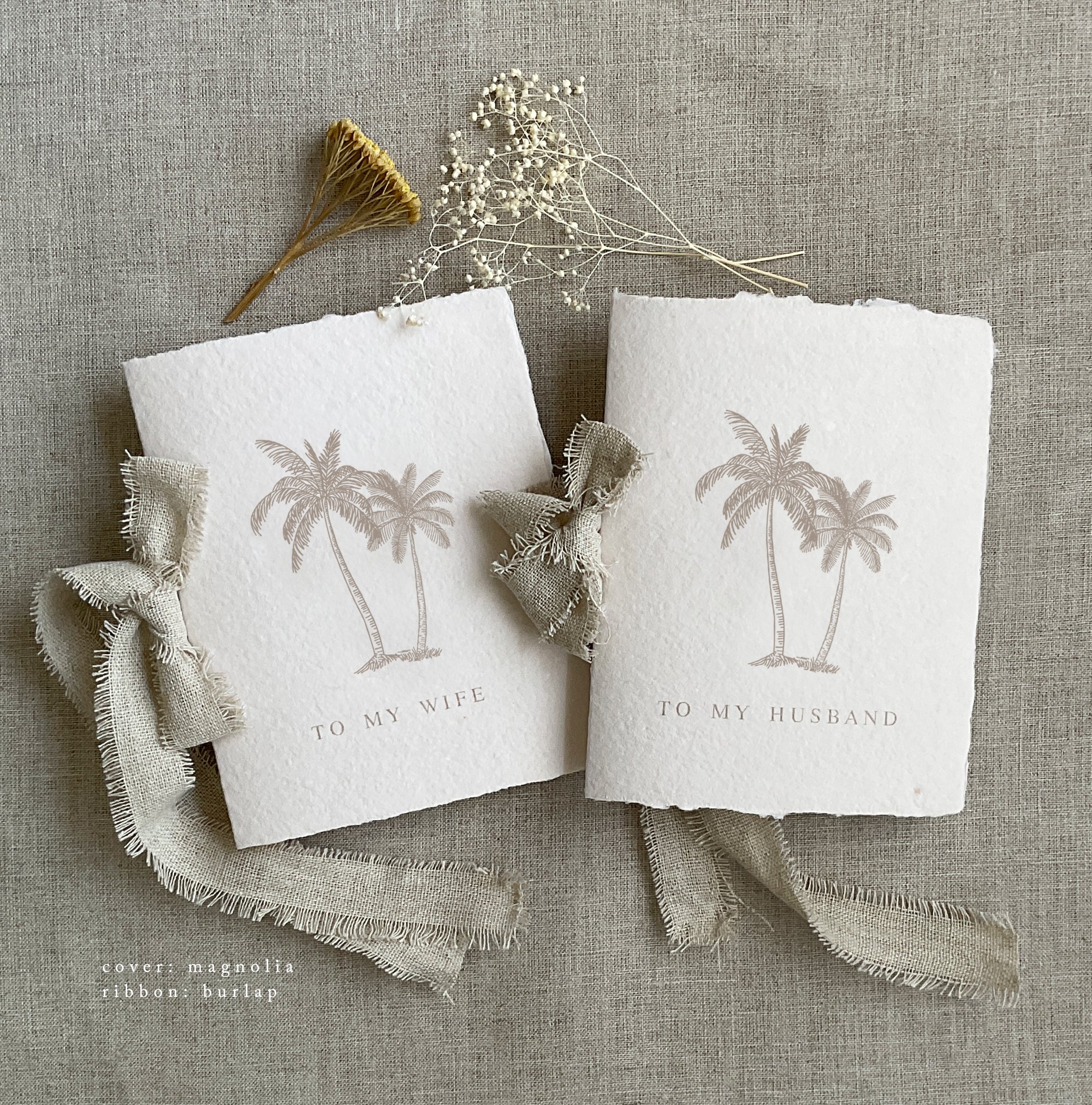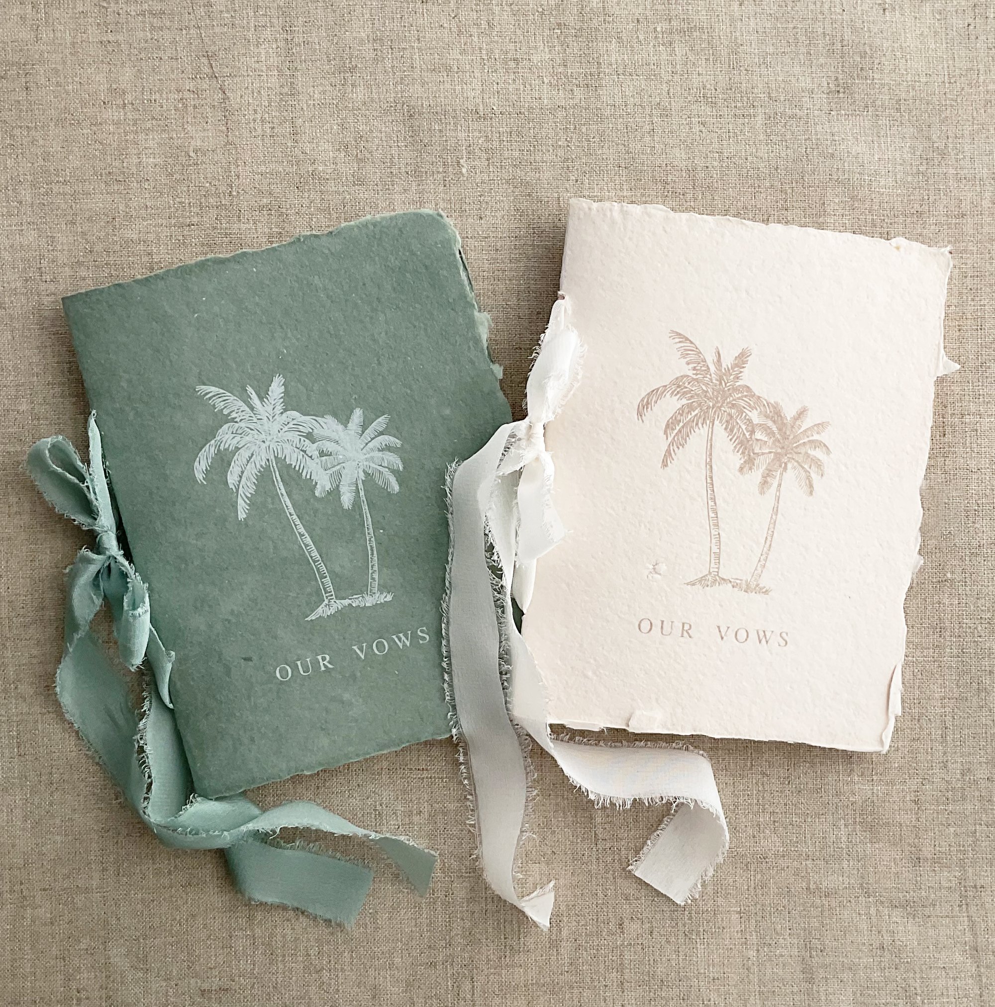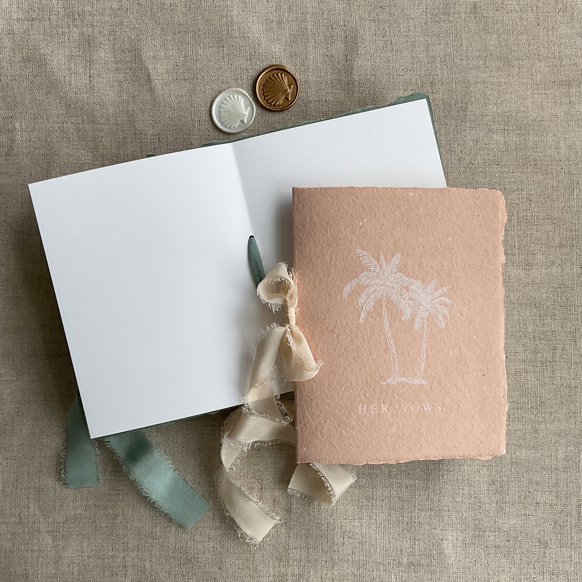 Heirloom handmade vow book is covered print handmade cotton paper with a full deckle edge and tied with crepe silk ribbon binding. It comes with blank classic white 80 lb text weight paper inside for writing, a total 12 pages (front and back) to write the vows on the book. Boxed packaging will arrive.