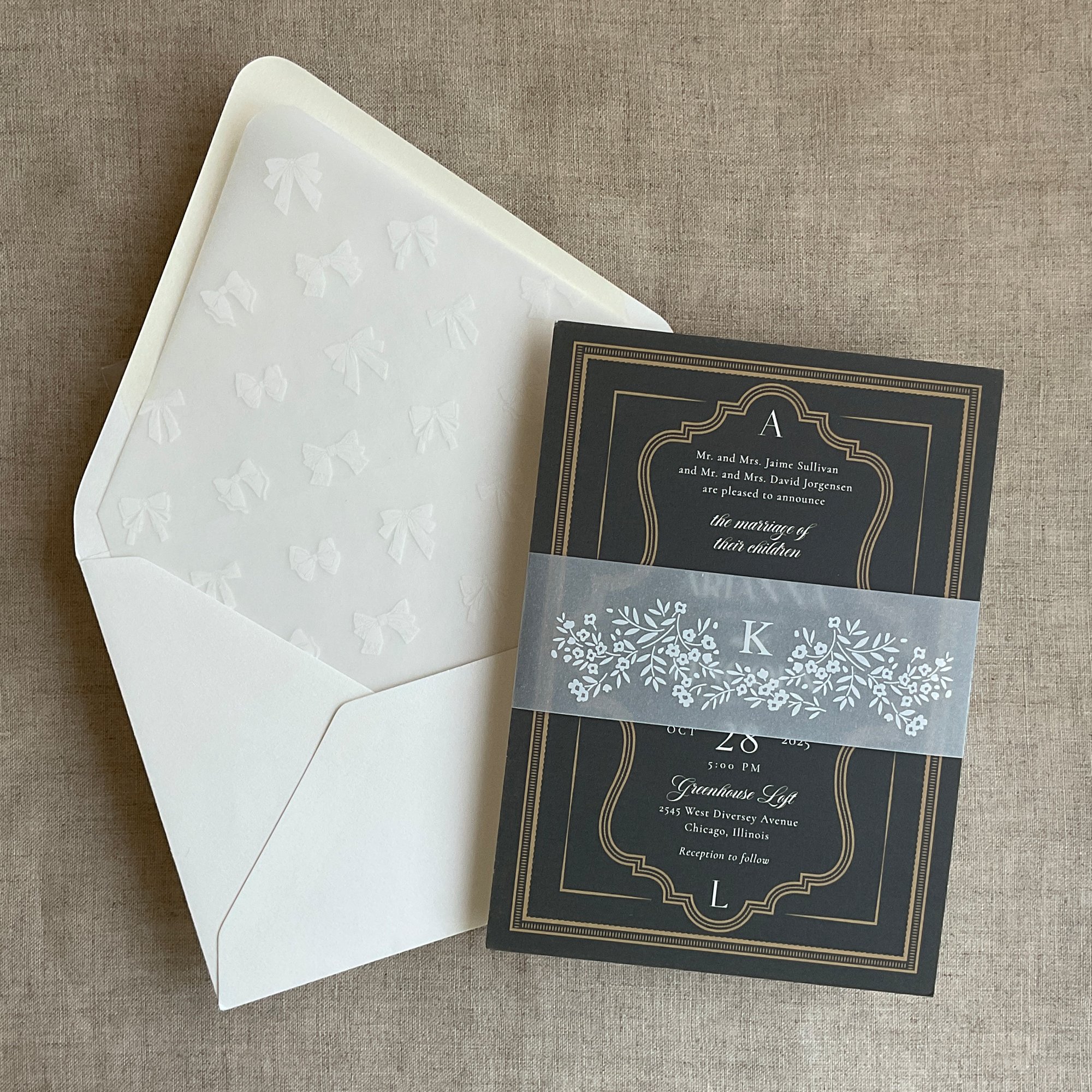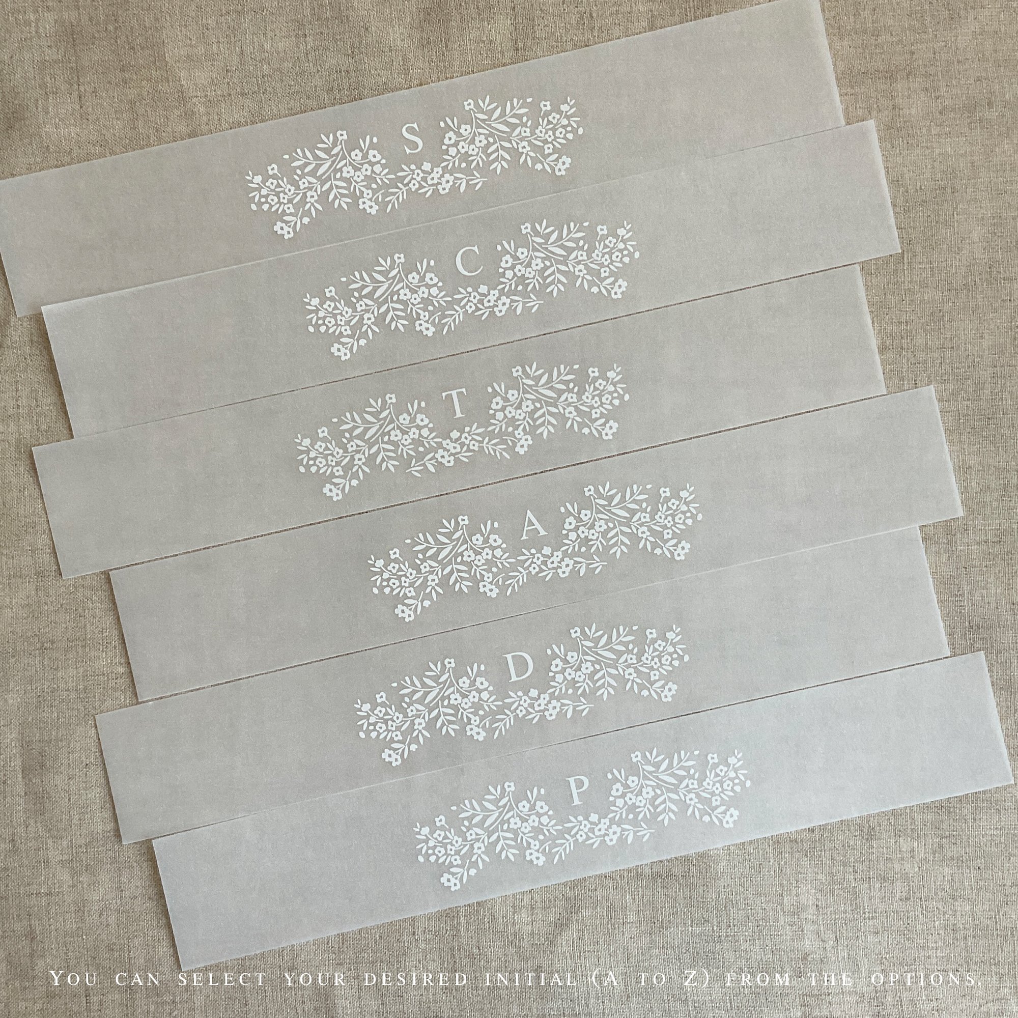 floral initial white ink printed vellum belly band 1.75 wide 11 inch length fit to 5x7 inches card