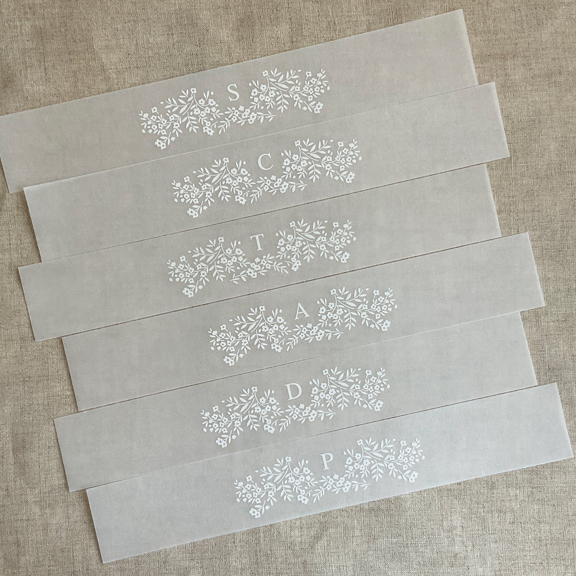 Floral initial white ink printed vellum paper belly bands PACK of 10