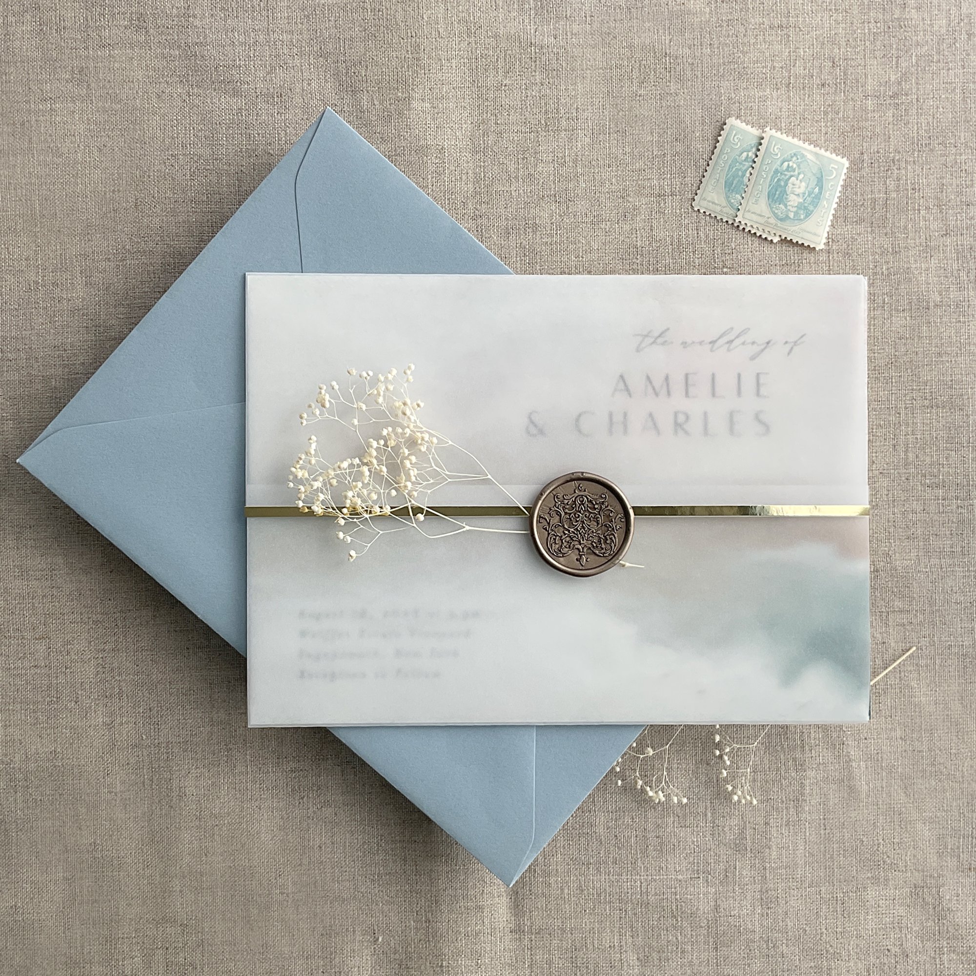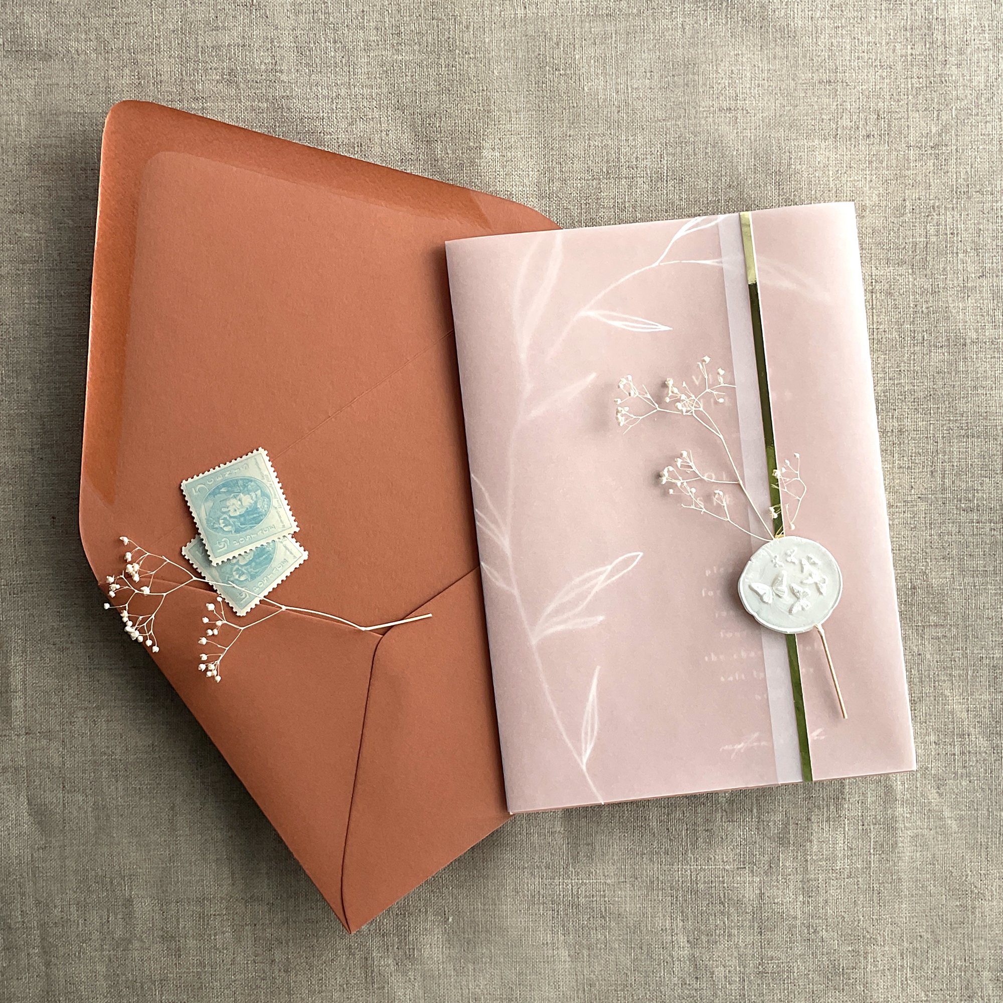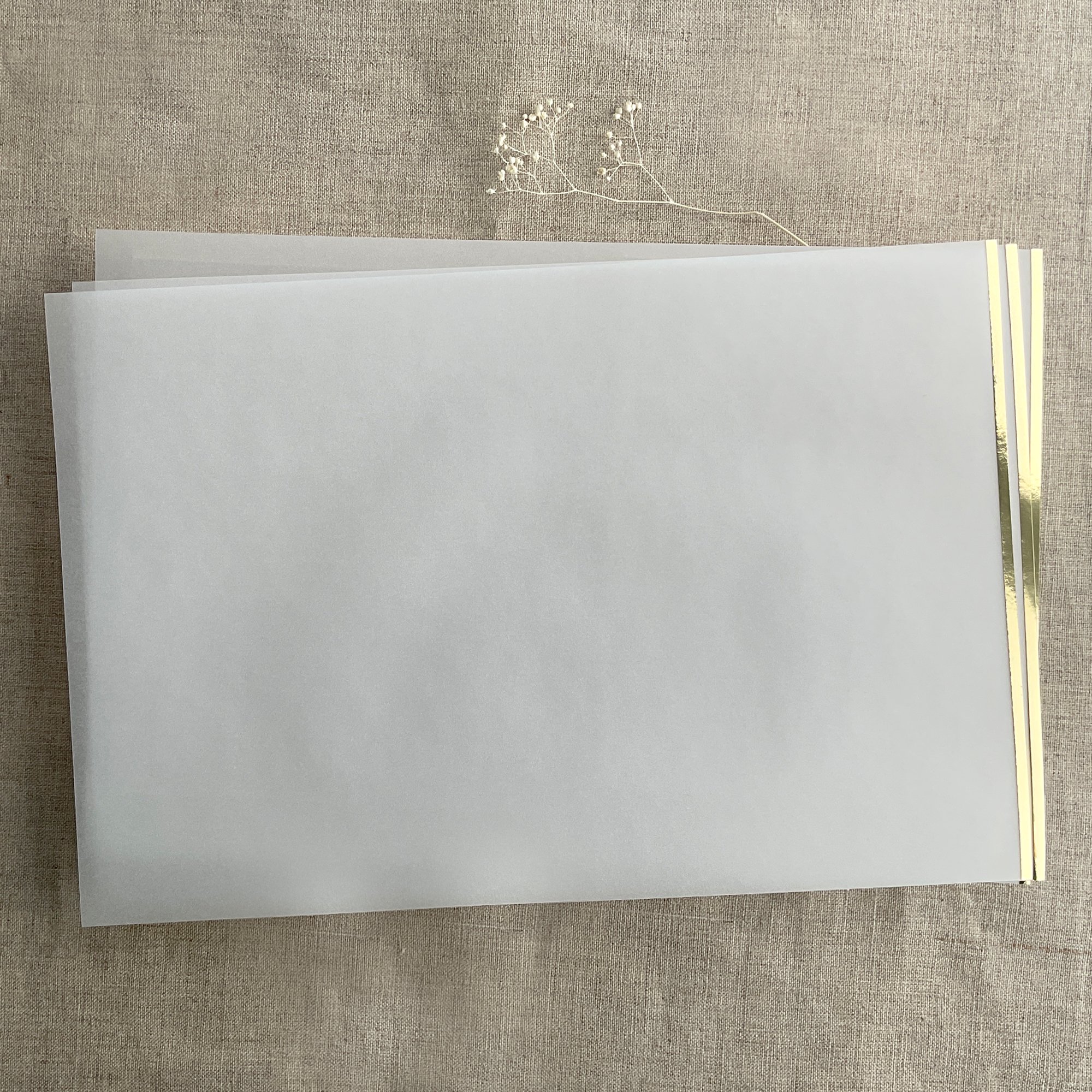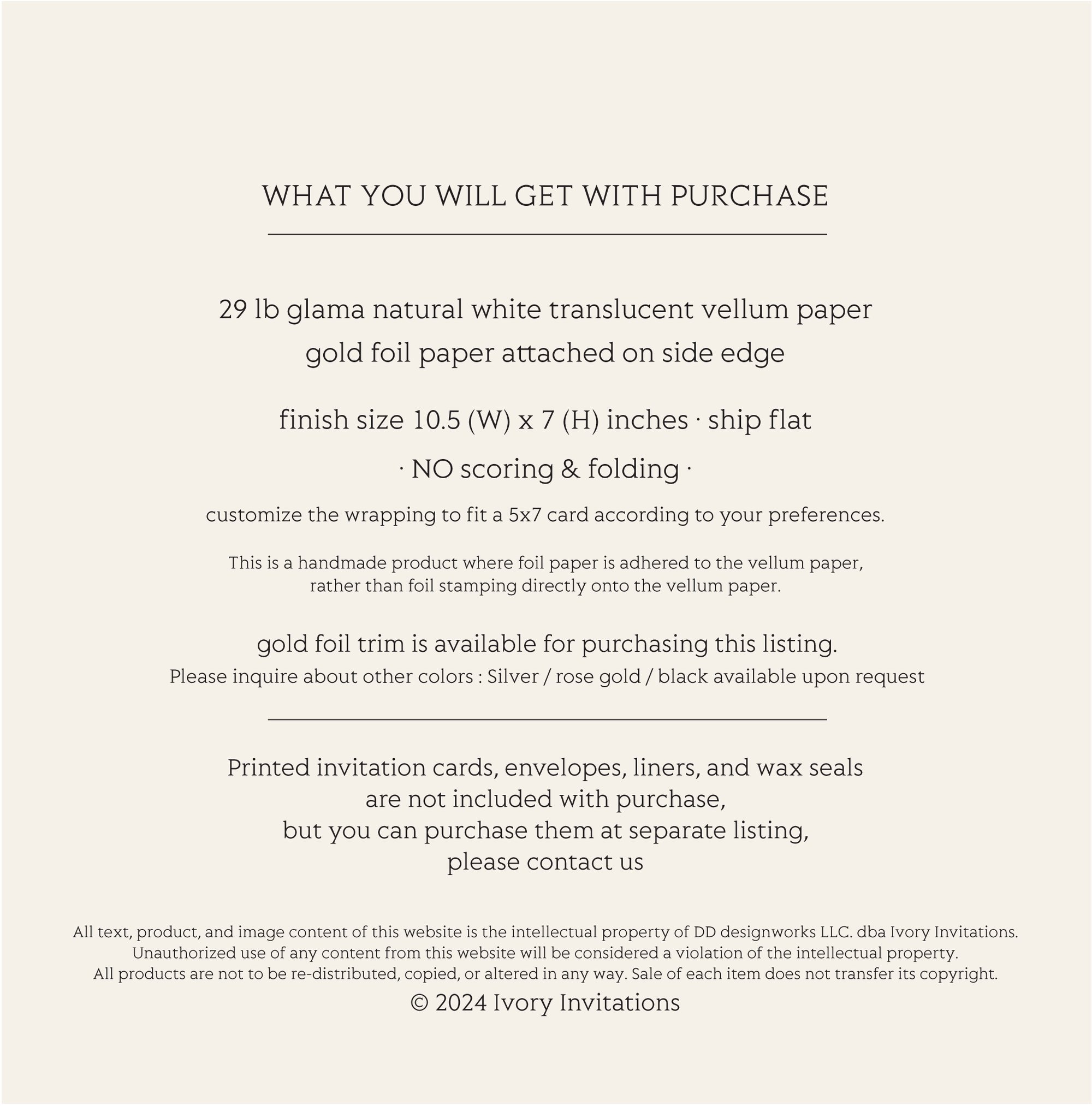 10 vellum sheets for 5"x7" (A7 card) with gold foil strip attached on edge. Finished size 7"x10.5" ship flat / not folded.