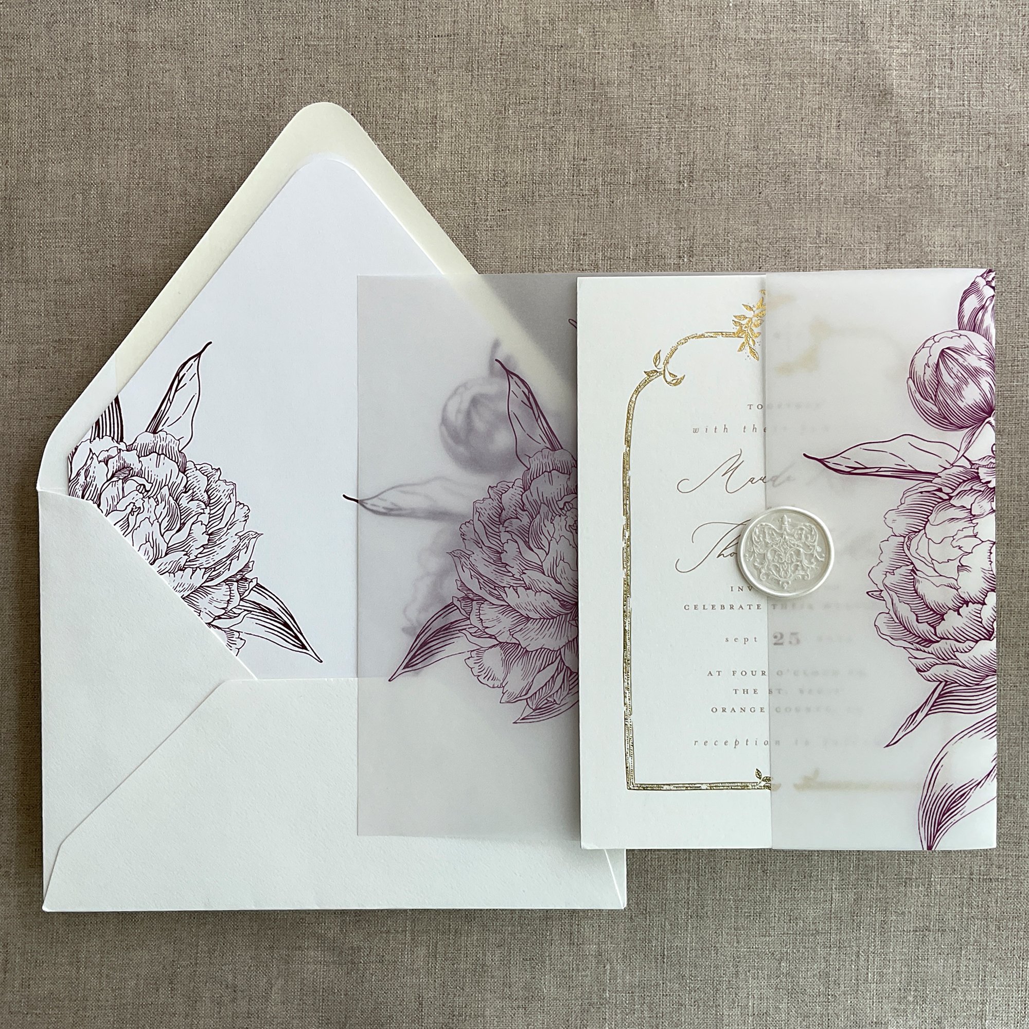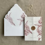 Grand Peony floral vellum wrap and envelope insert for A7 euro flap envelope