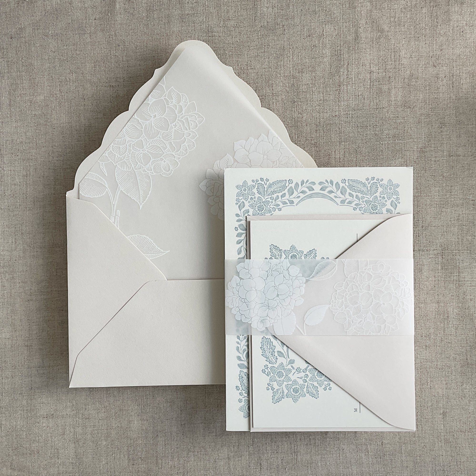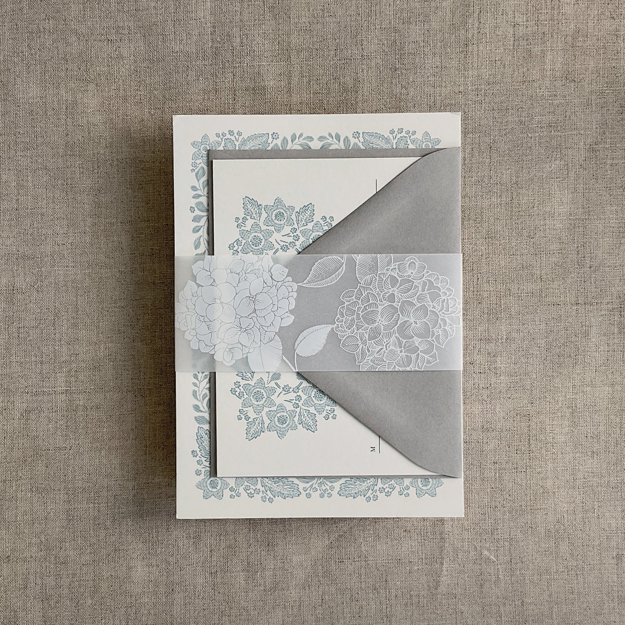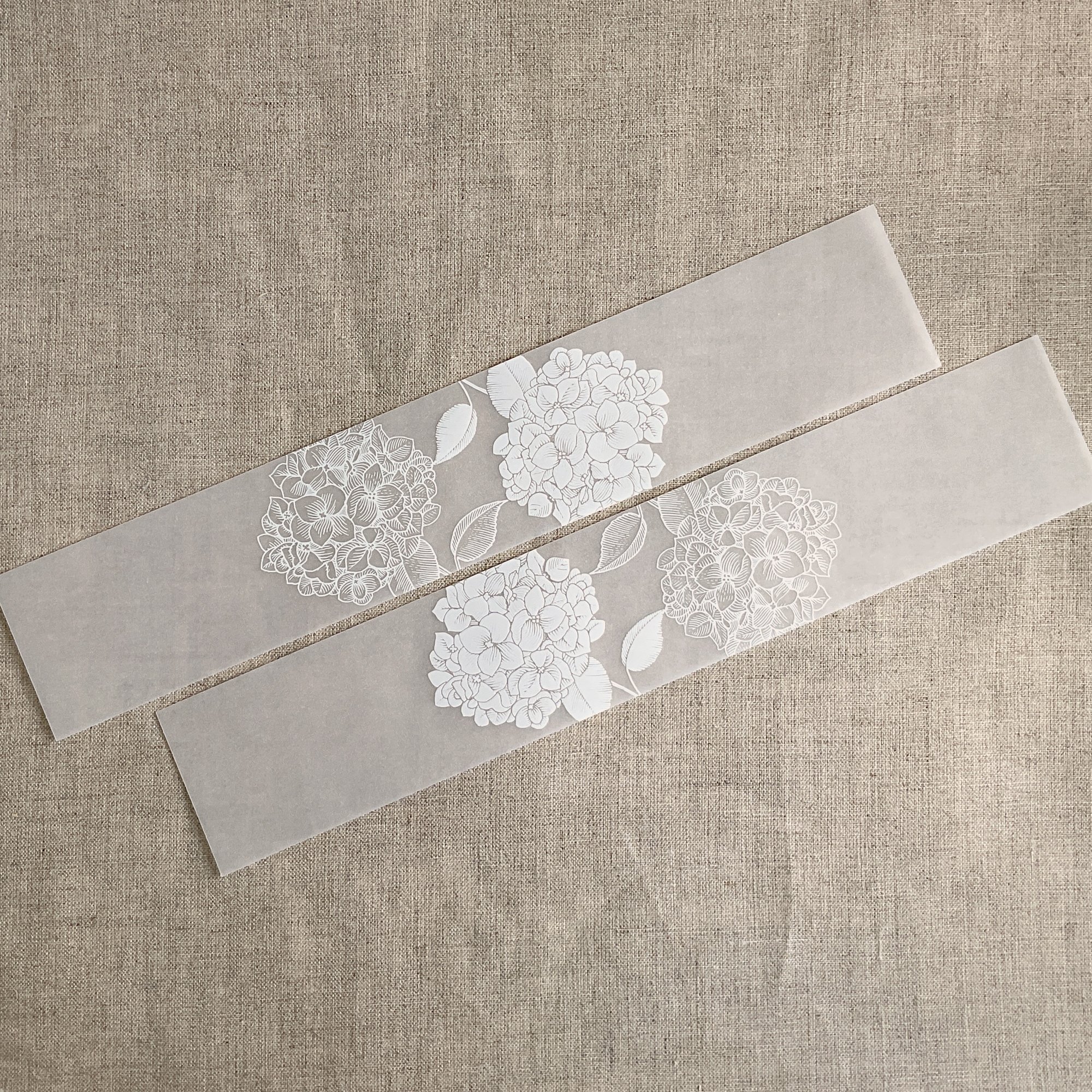 Hydrangea white ink printed 2 inch wide white translucent floral Vellum belly band for 5x7 inches card