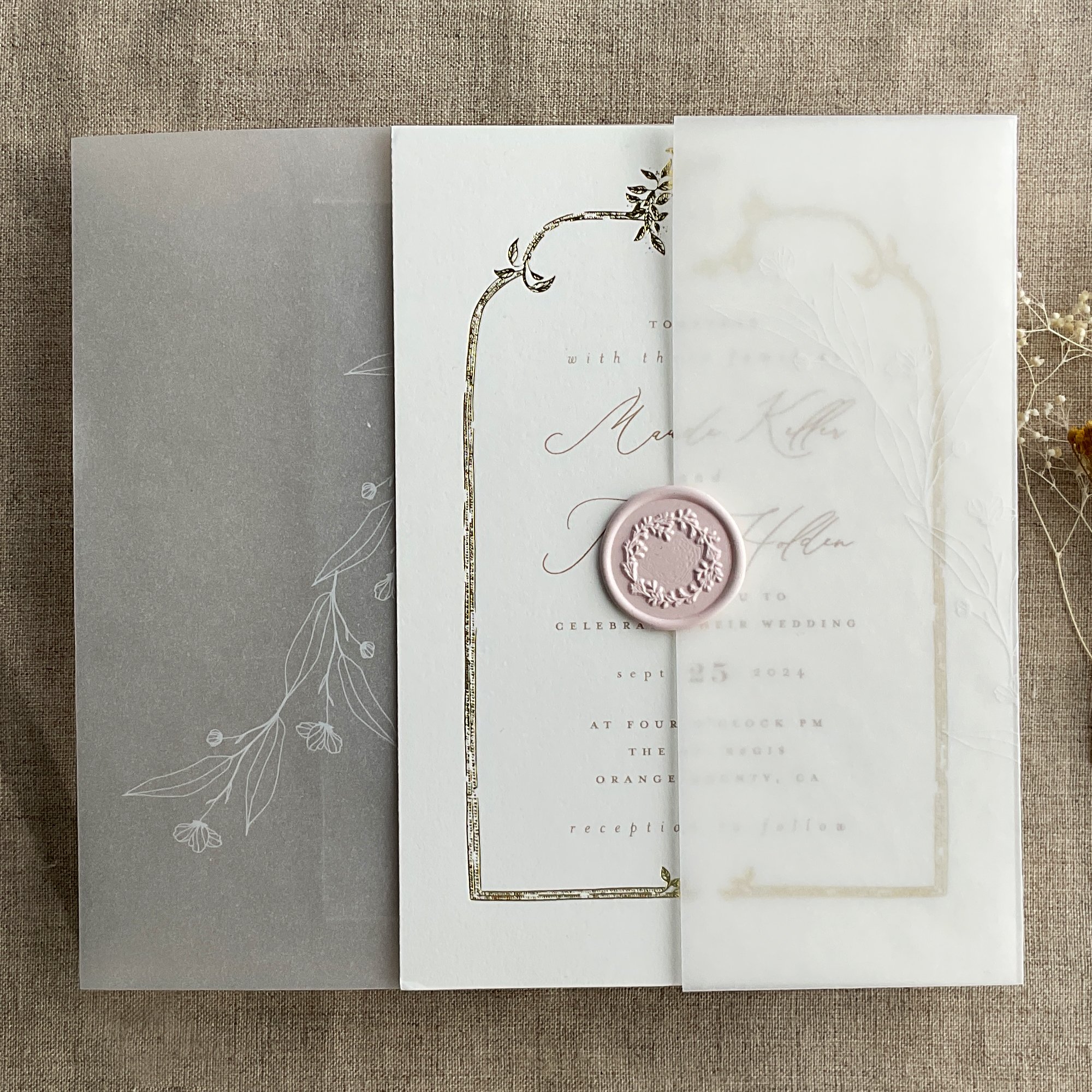on 29 lb glama natural white translucent vellum paper / Printed in-house by ivory invitations Made In USA