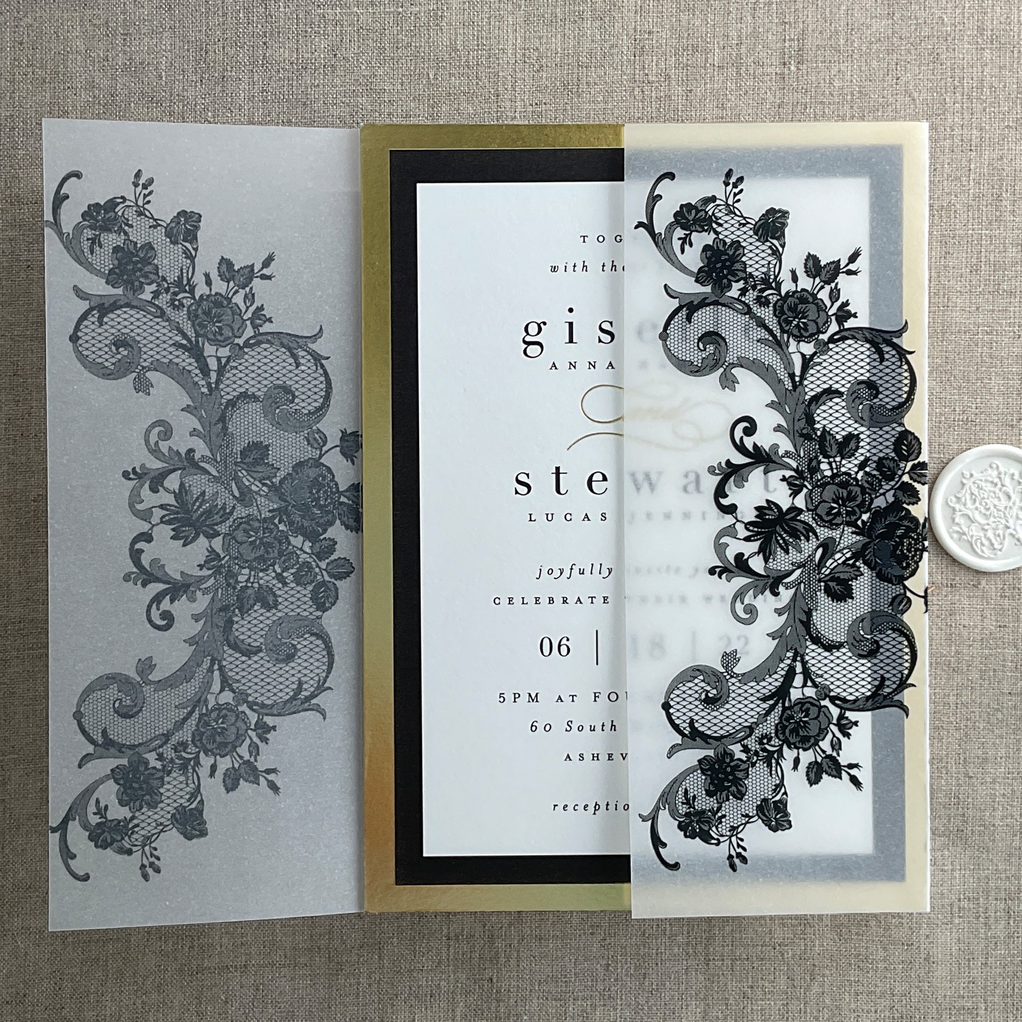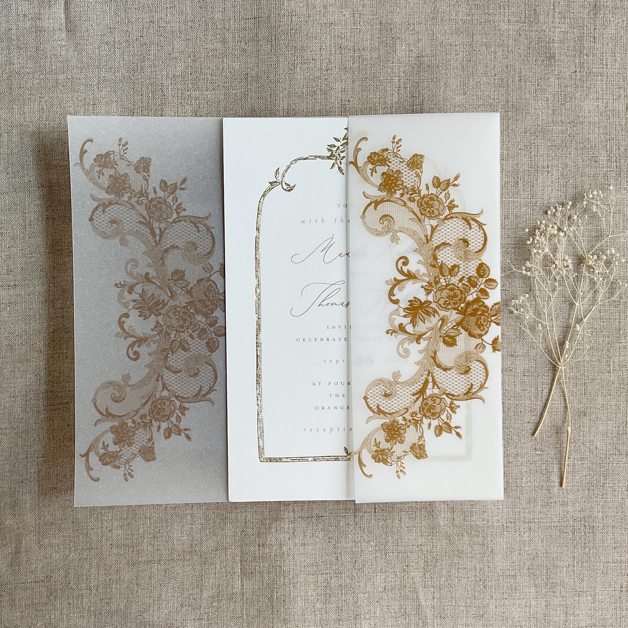 on 29 lb glama natural white translucent vellum paper / Printed in-house by ivory invitations Made In USA