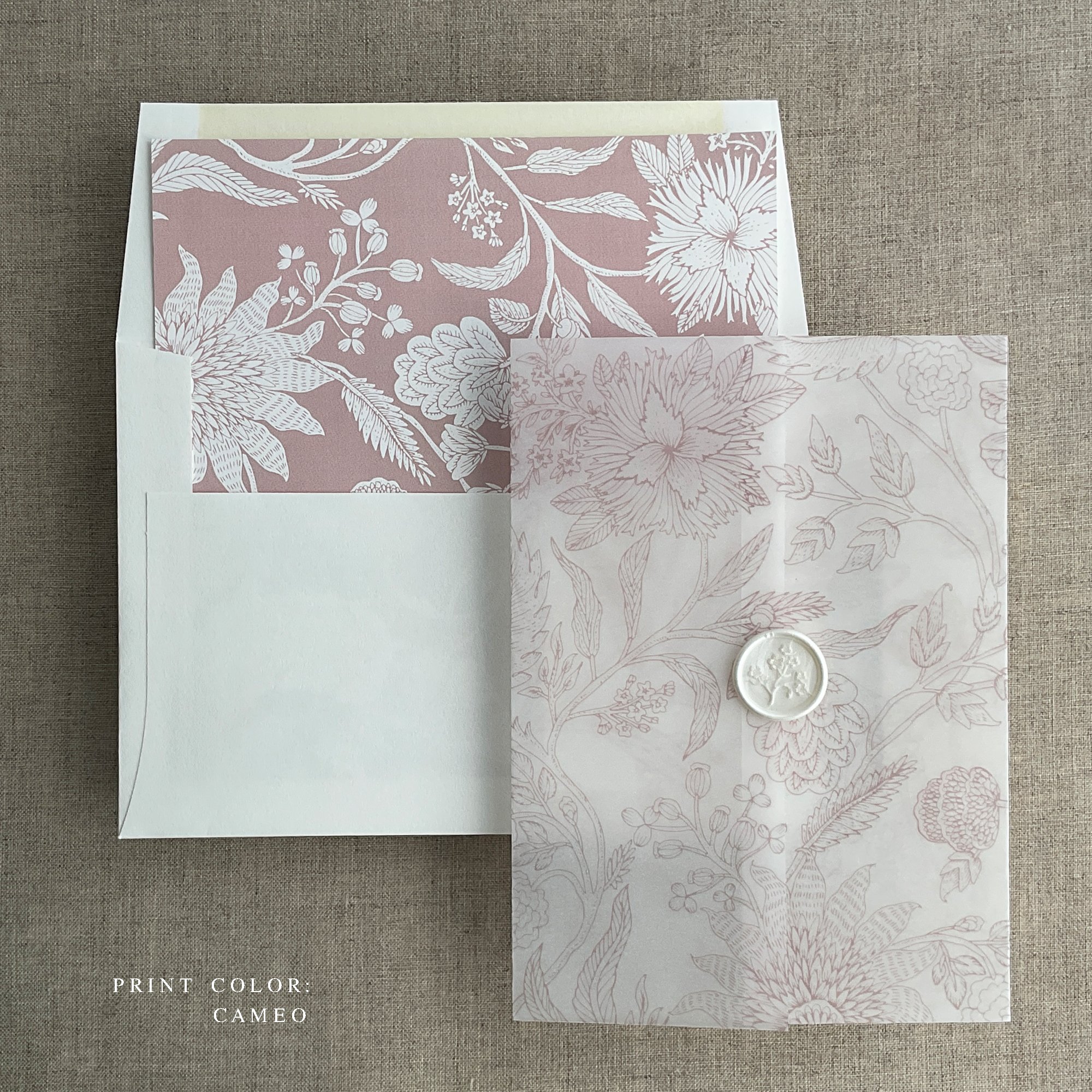 10-5"x7" (A7 card) pre-fold vellum wrap in a color ink on 29 lb natural white translucent vellum paper / Printed in-house by ivory invitations Made In USA