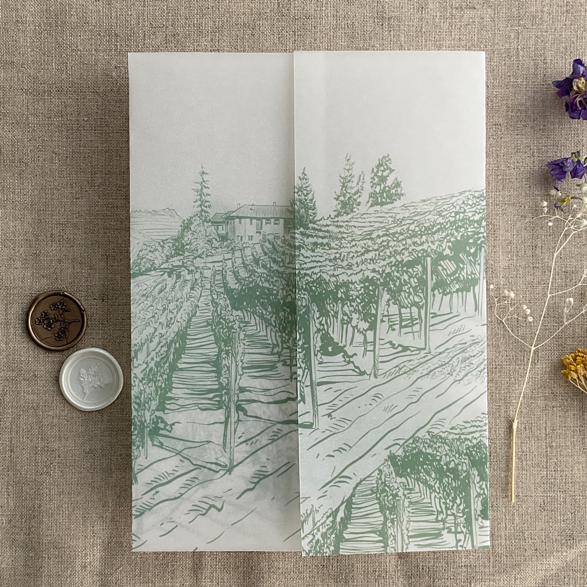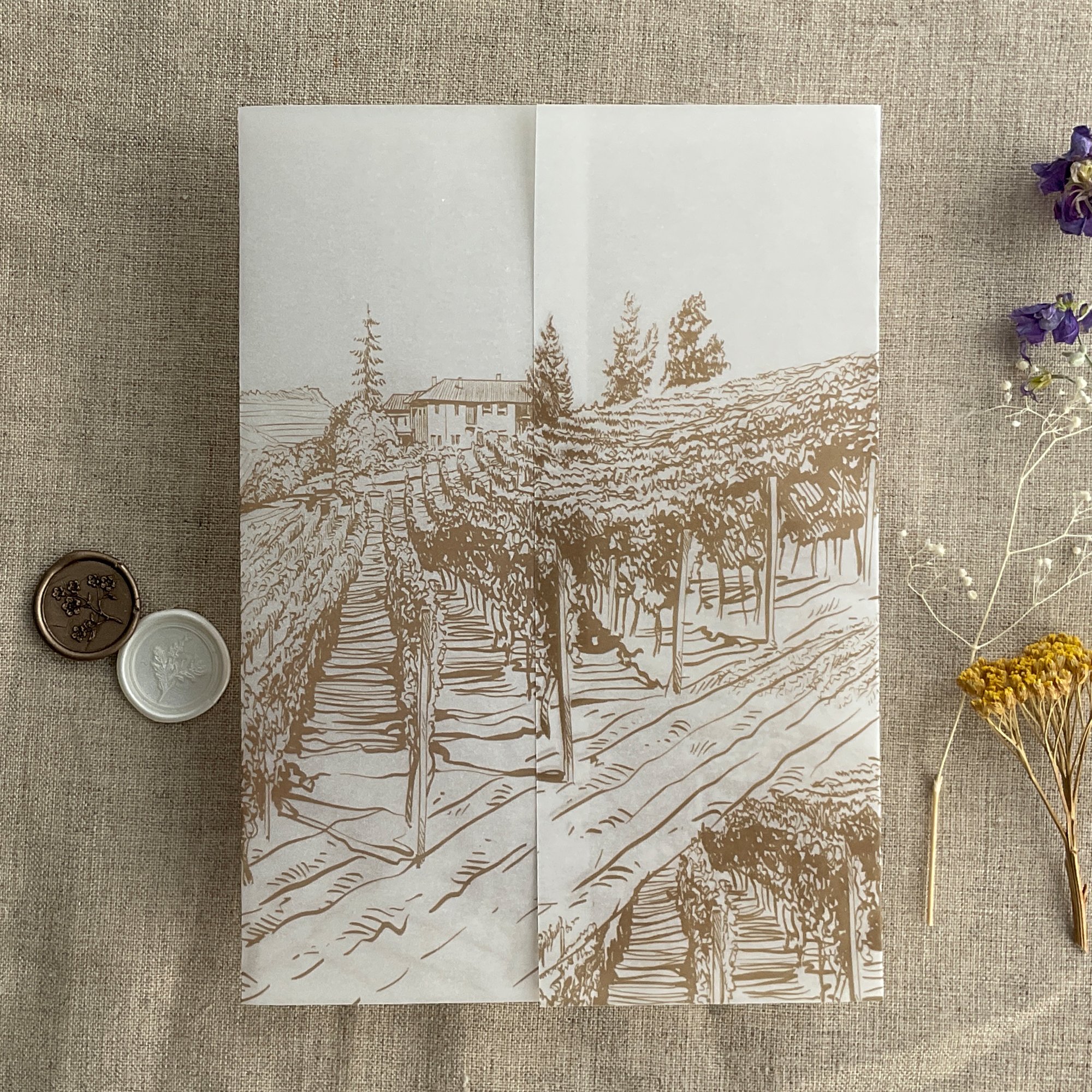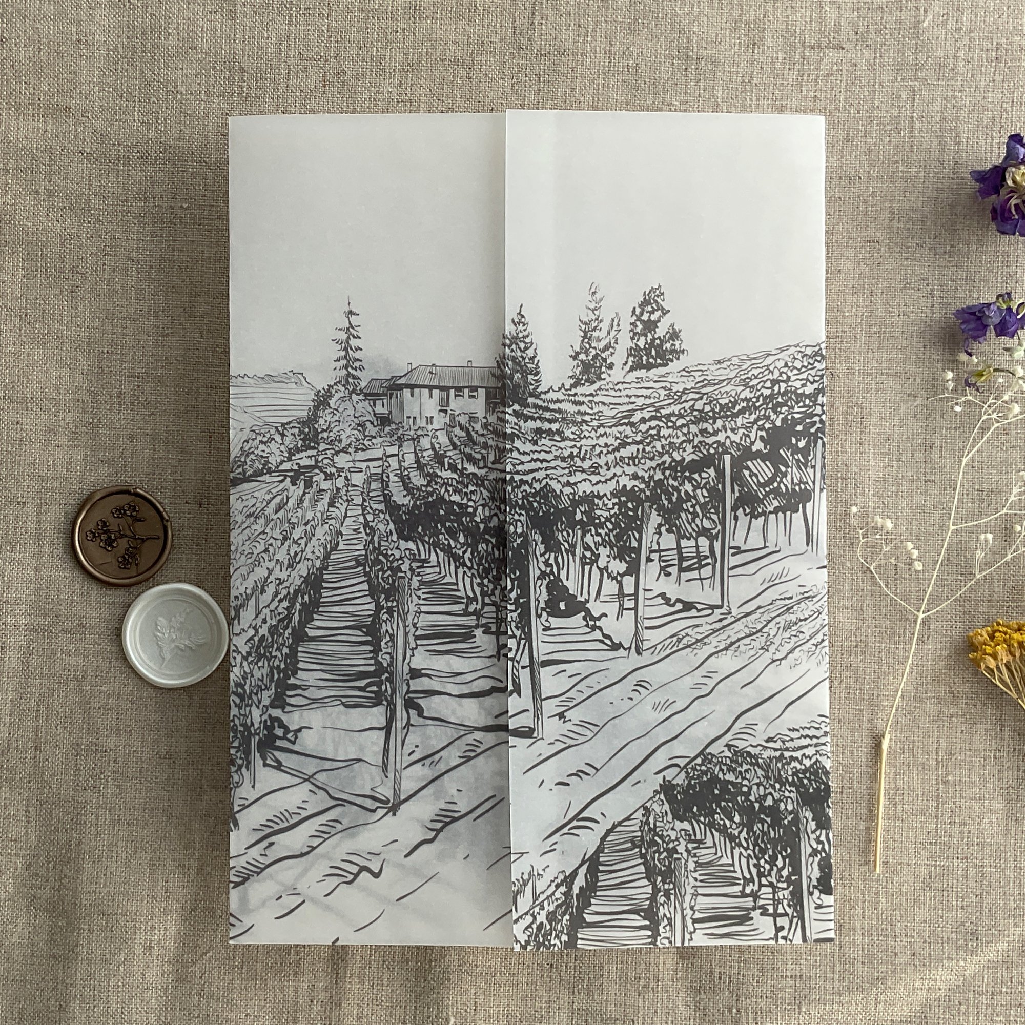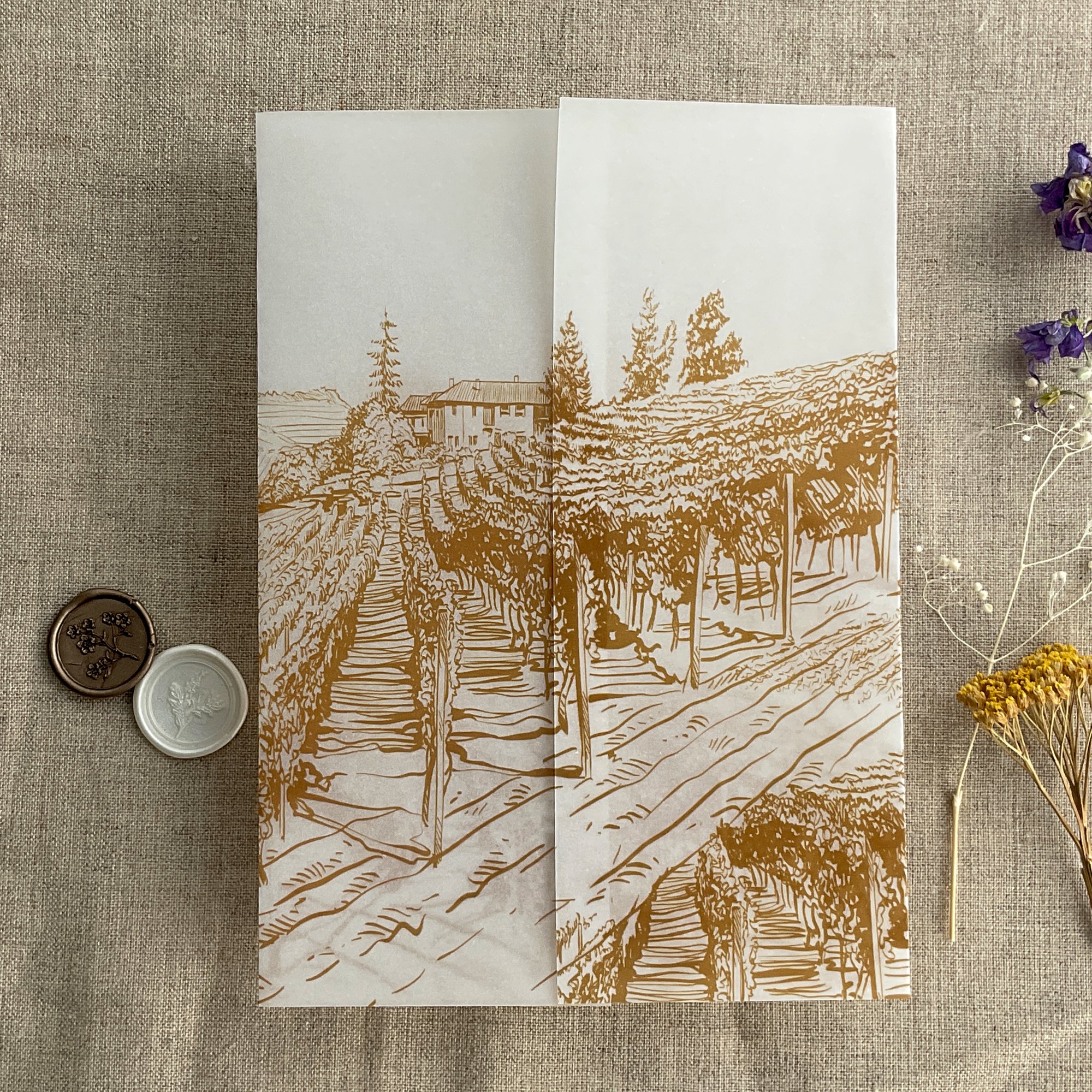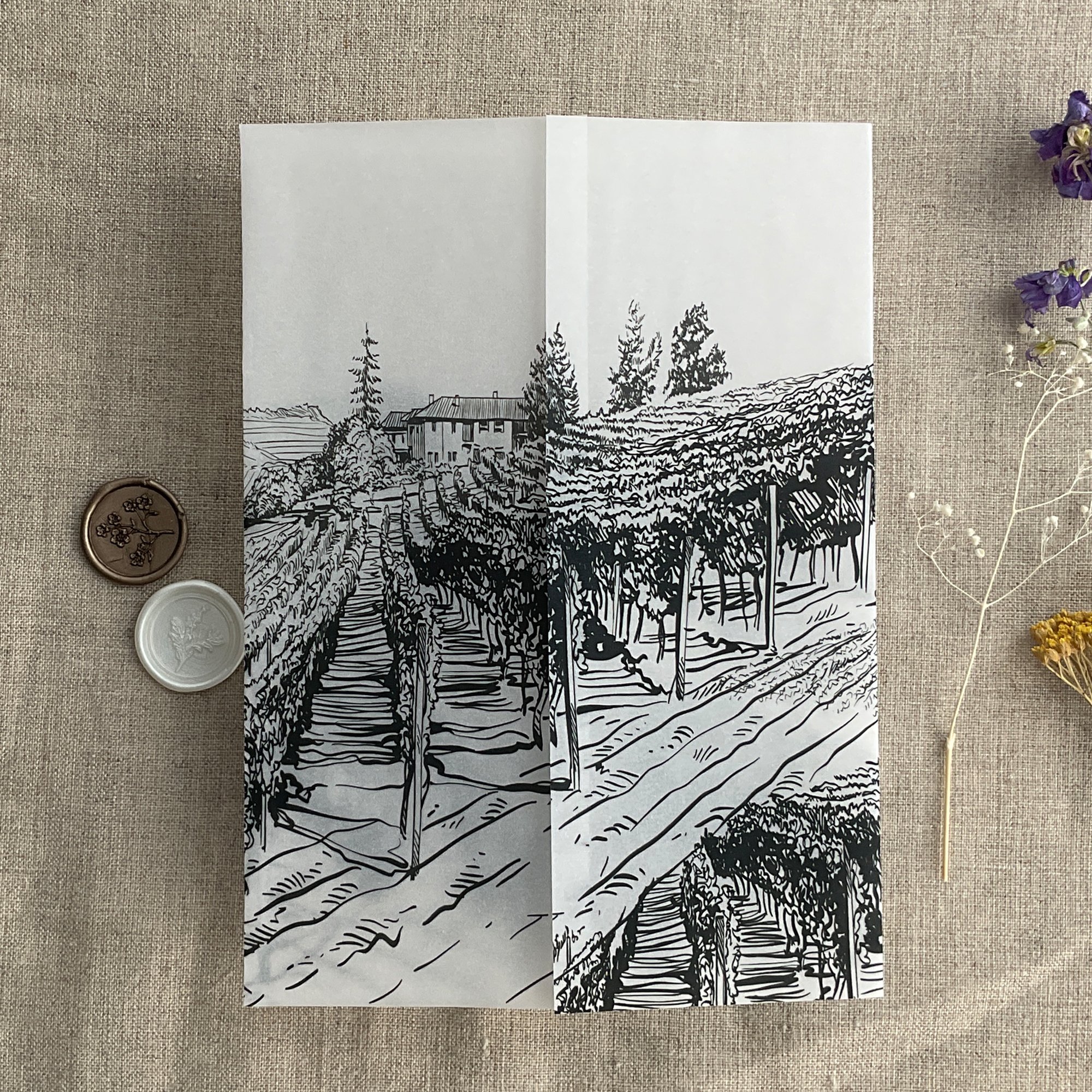 Rustic vineyard sketch printed vellum wrap for 5x7 cards PACK of 10
