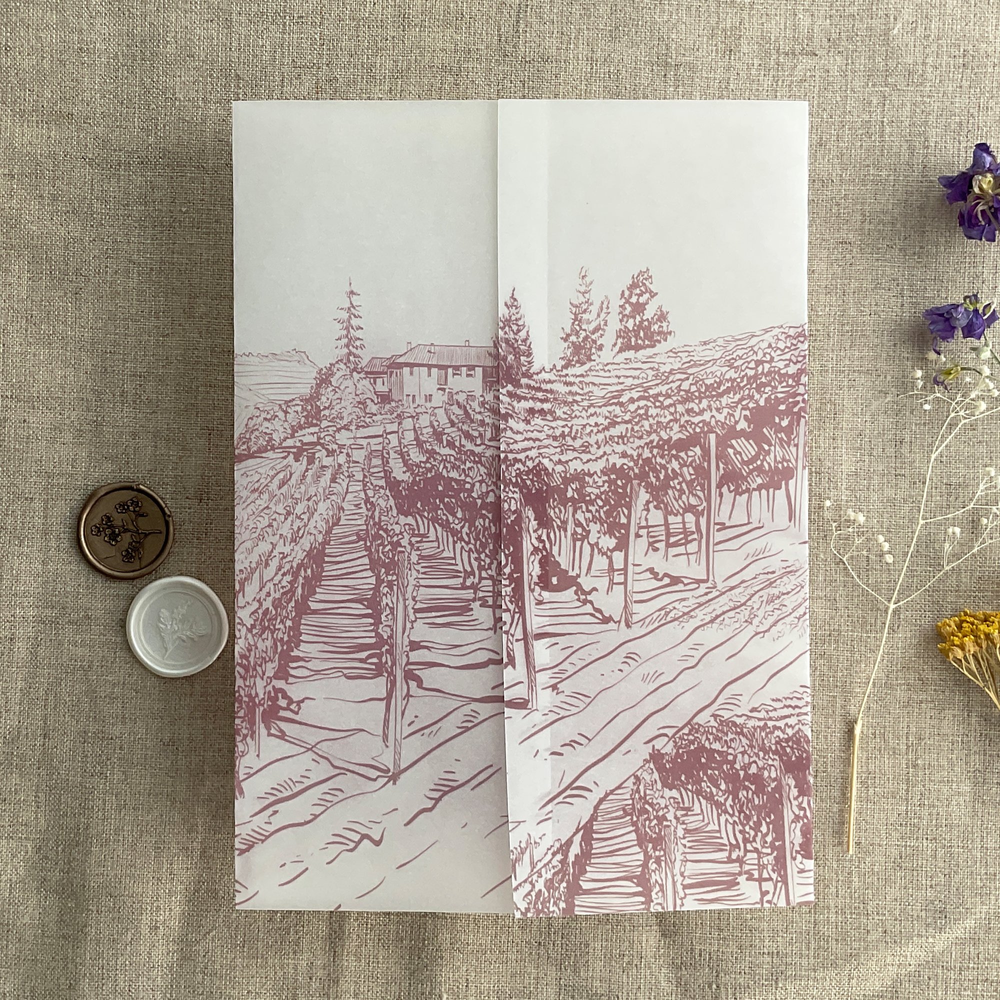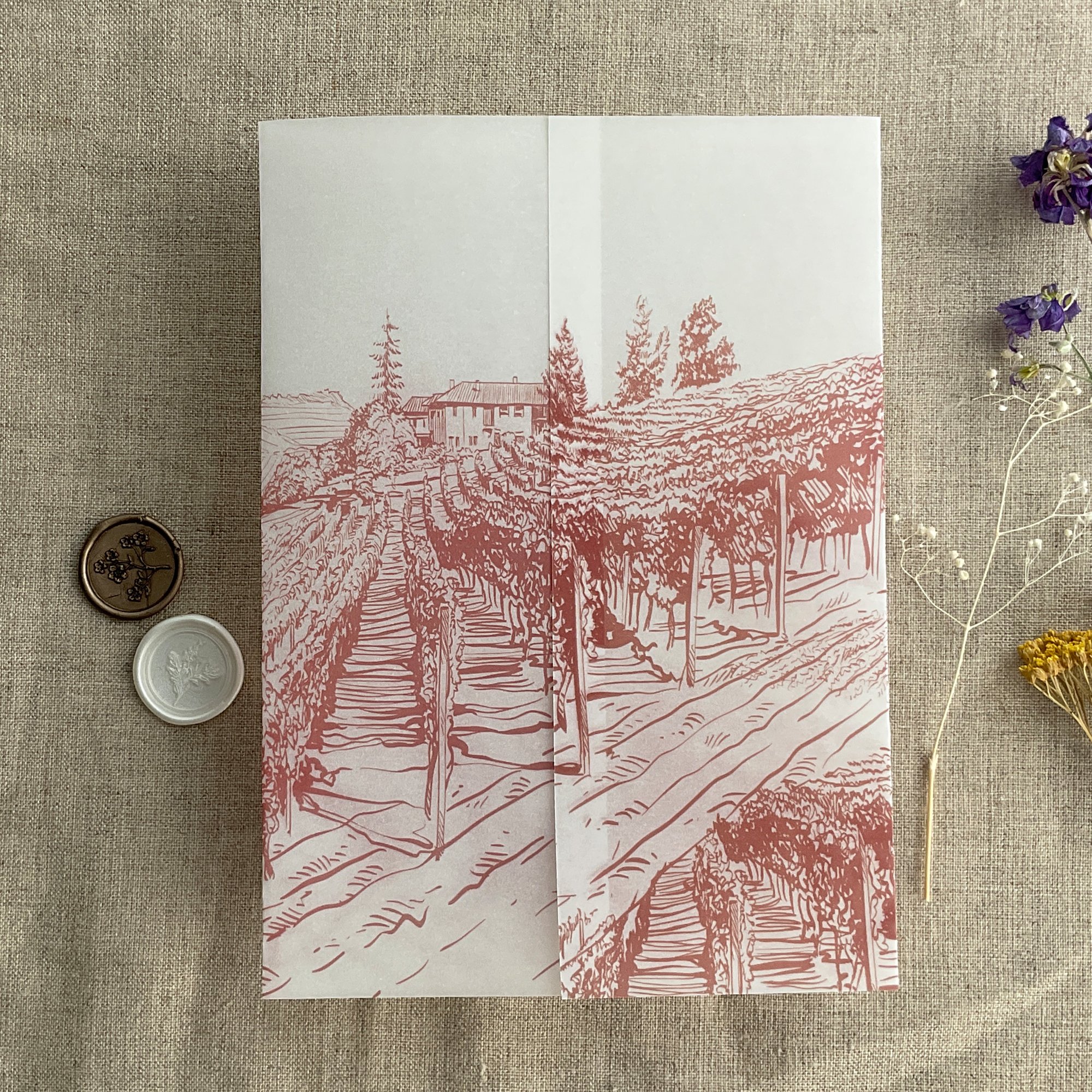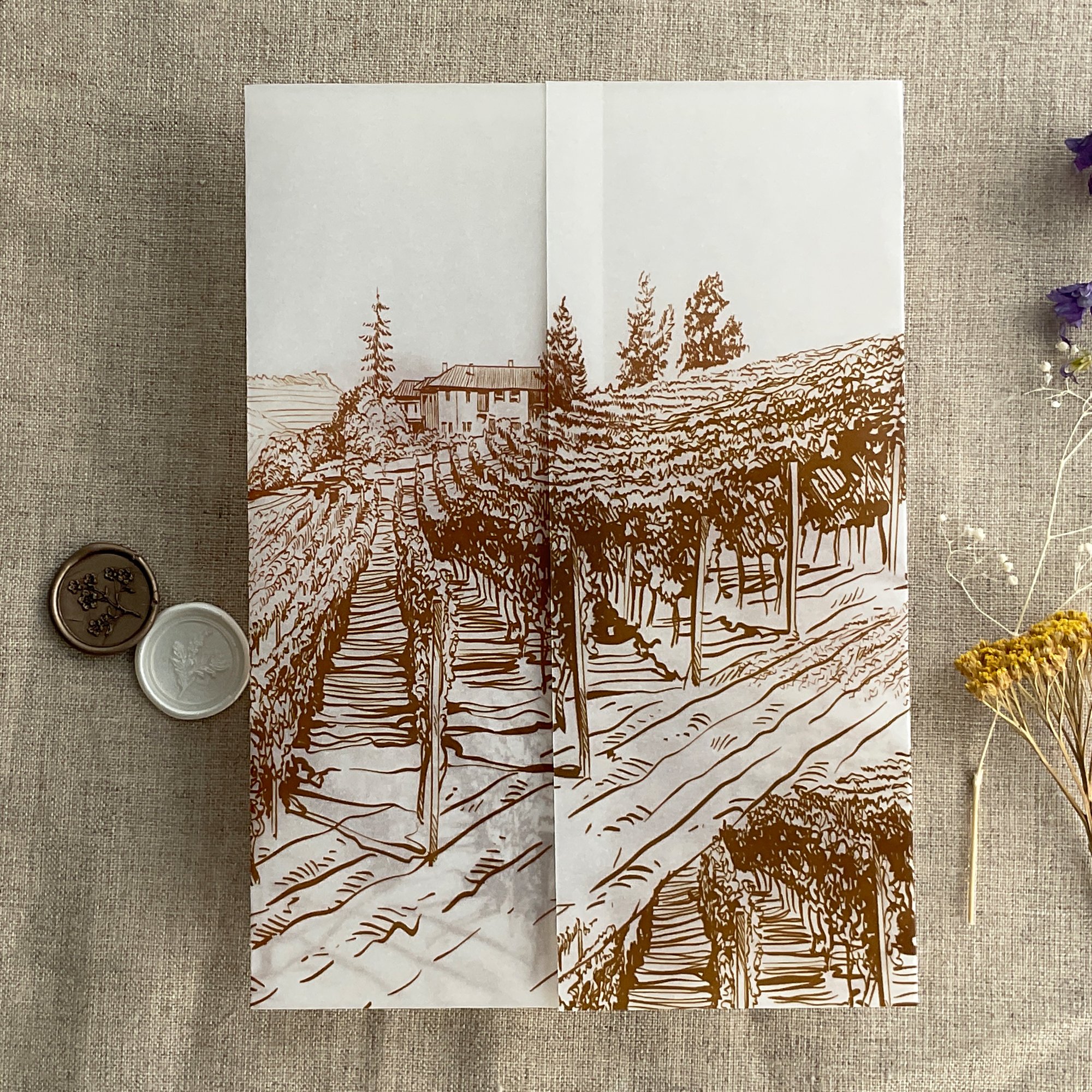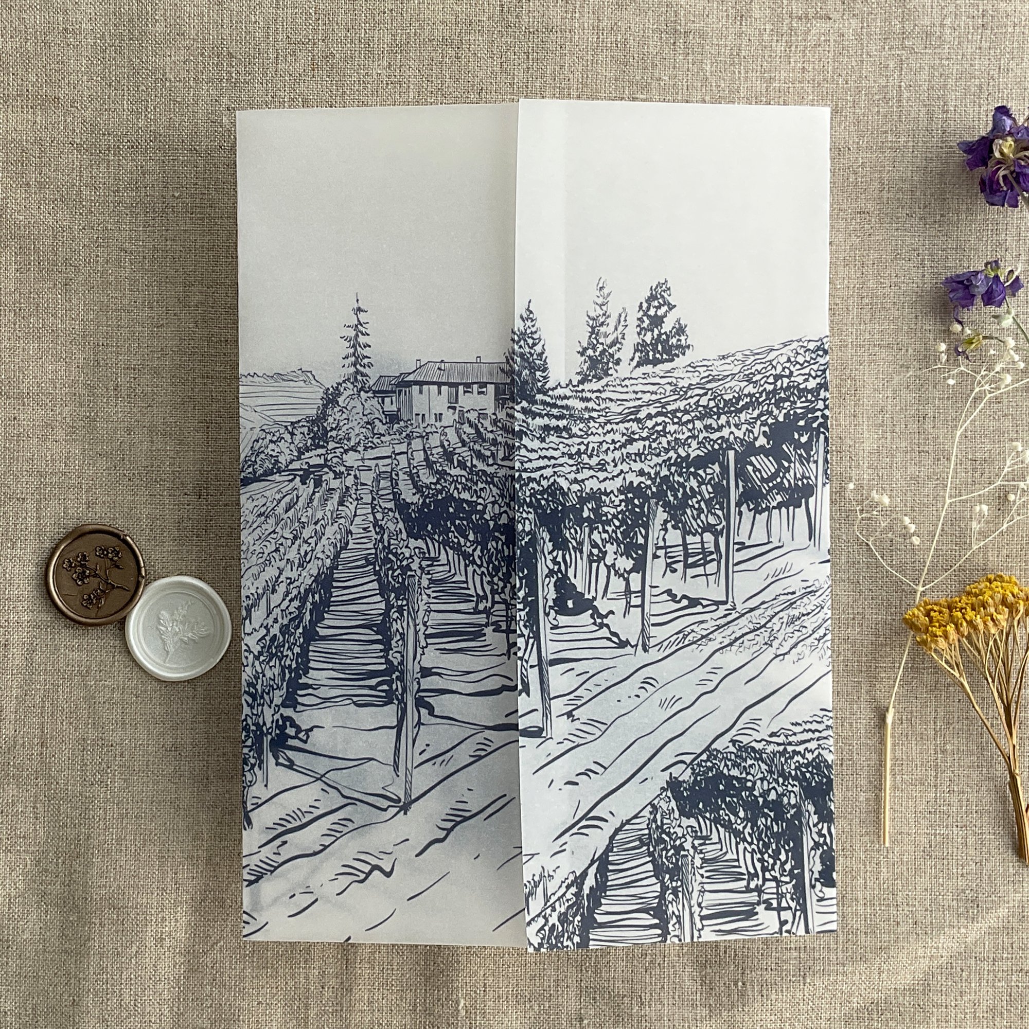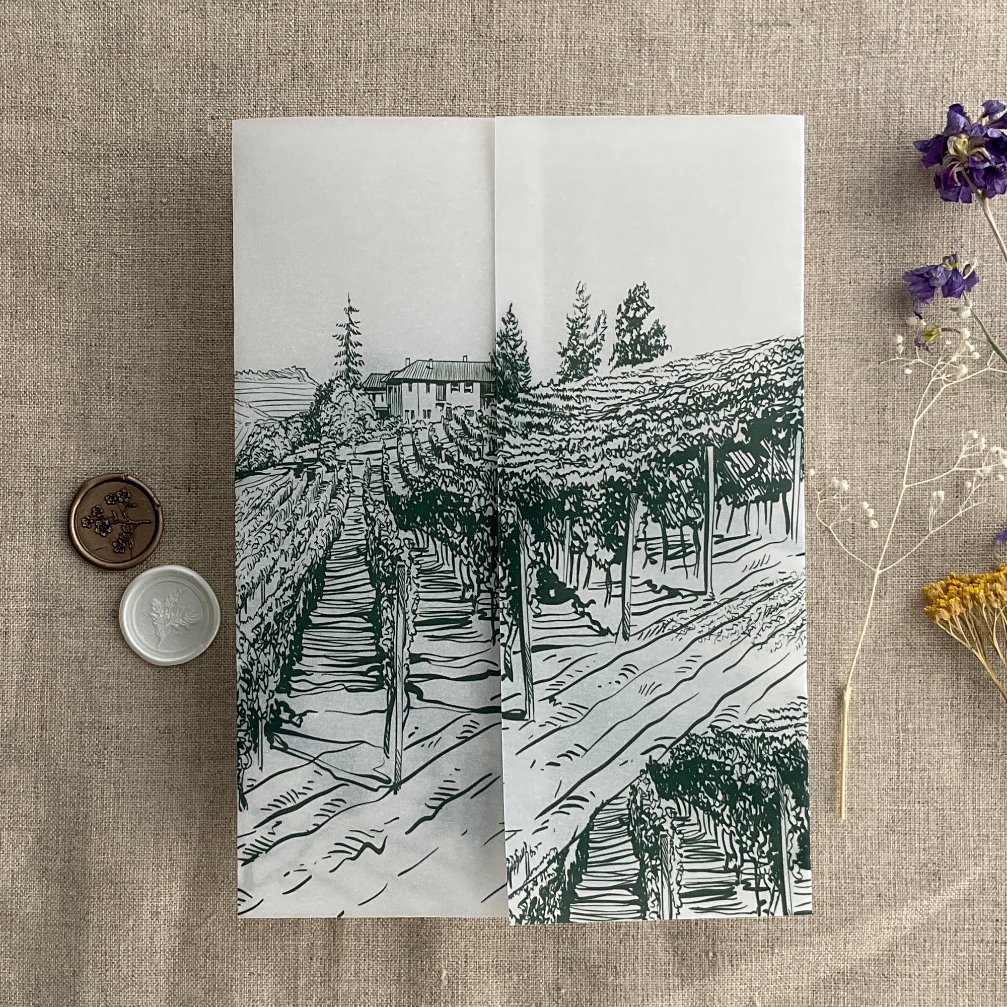 Rustic vineyard sketch printed vellum wrap for 5x7 cards PACK of 10