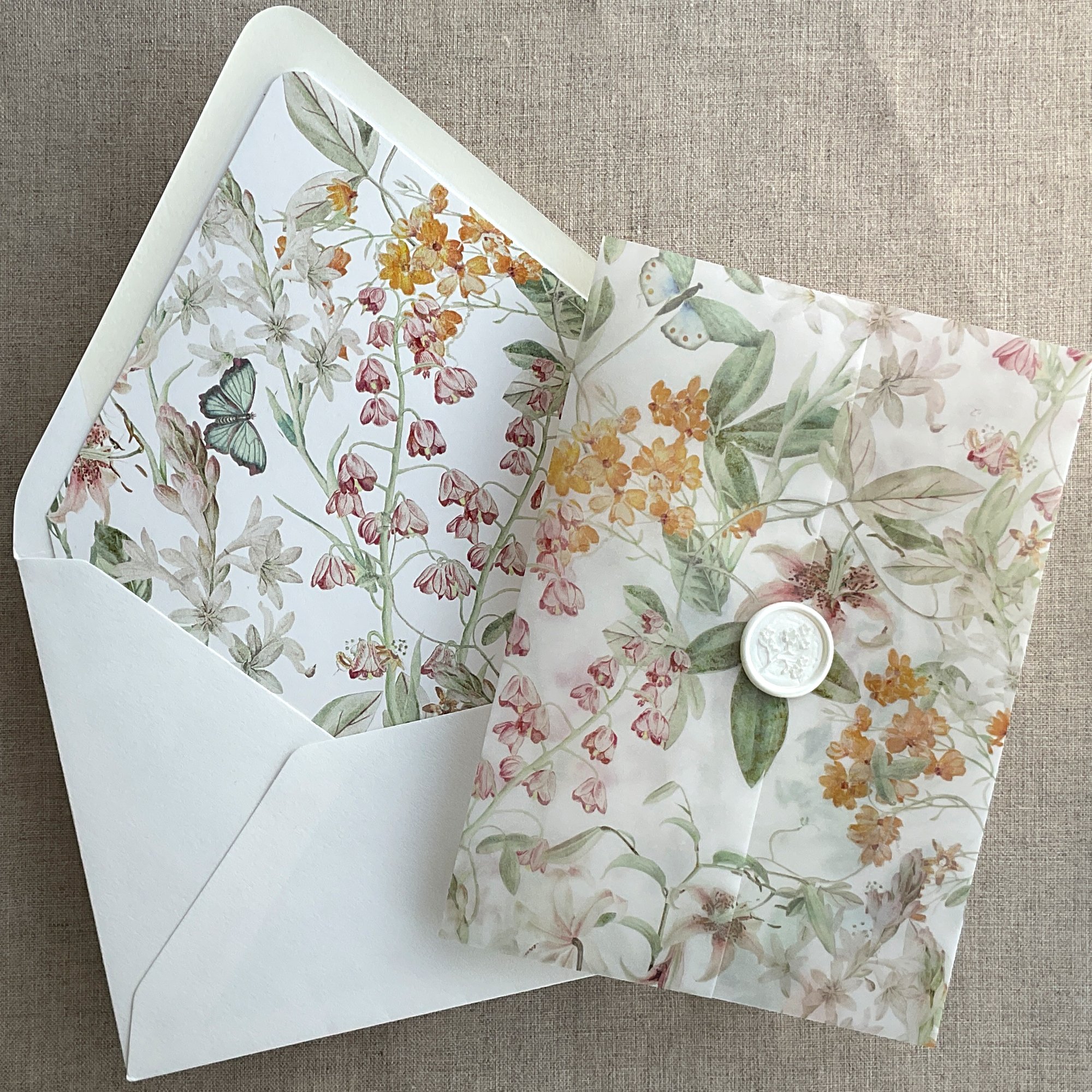 Sage orange buttercup floral vellum wrap and envelope liner